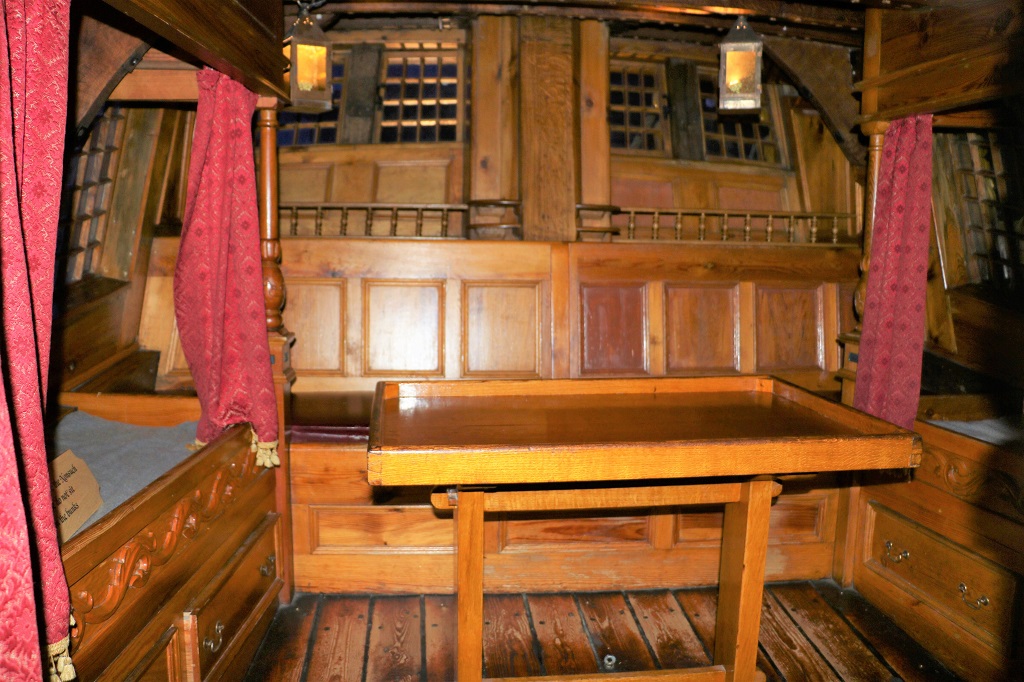 Even with the upper level viewing area you could not get a shot that showed how high the masts and sails were. Seven people at a time were allowed aboard. There are 4 kilometers of ropes of various sizes on the ship. Rope coils were everywhere. When Nonsuch origianally sailed she had 12 crew. Four slept in the Captain’s cabin at the stern (there are only two bunks but two would be on duty while two were off). The other eight crew slept (usually four at a time unless All Hands were needed due to a storm or something) in the hull below deck.