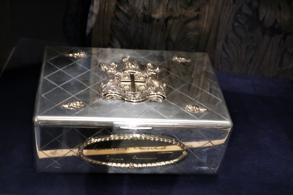 This silver cigar box with the HBC Coat of Arms on the lid was given to Sir Winston Churchill in 1956 to commemorate his honorary postion of Grand Seigneur in the Hudson’s Bay Company. (I wonder how they got it back?)