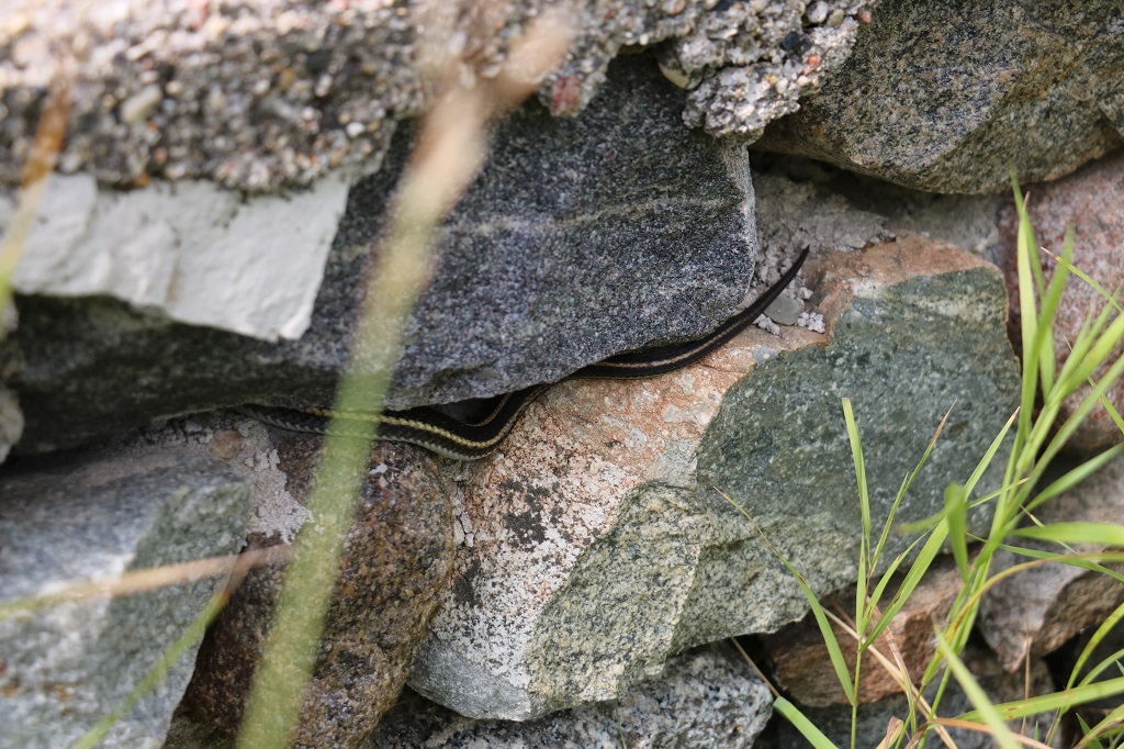 There were three geocaches hidden in the park. One was AWOL, one we couldn’t find – but saw a garter snake warming in the broken foundation of the old flour mill – and one we found.