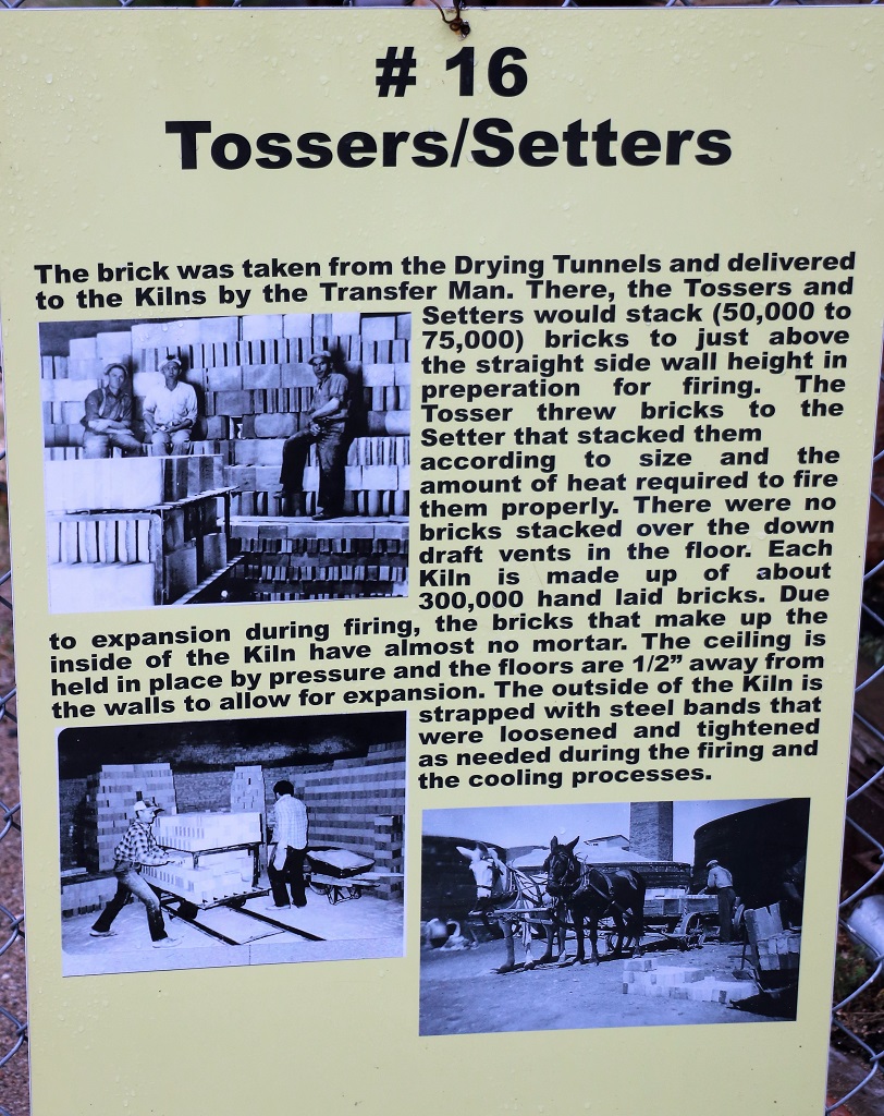 All of these sign boards used to be located within the various buildings to describe what went on in each place to make the bricks. Now that the property is gated they were hung in the one place.
