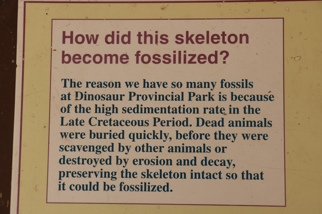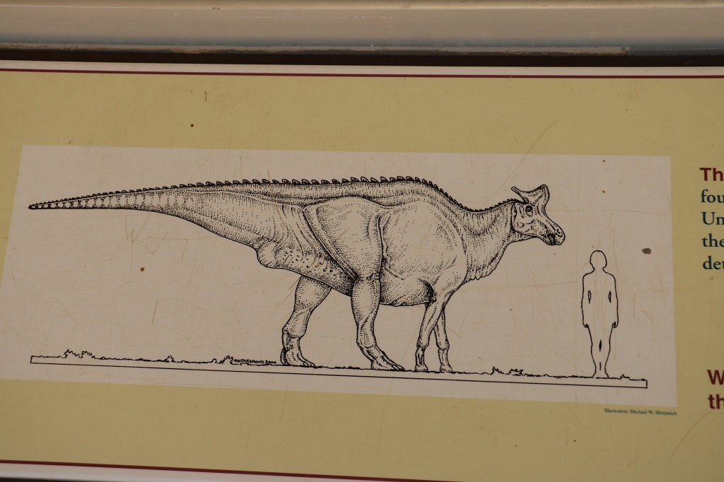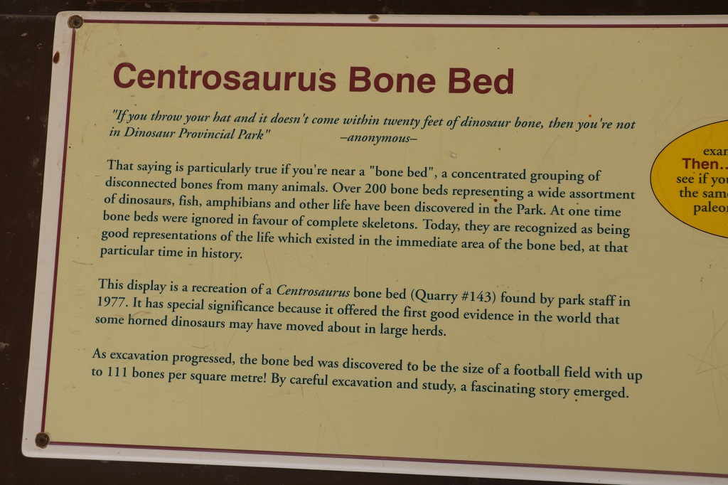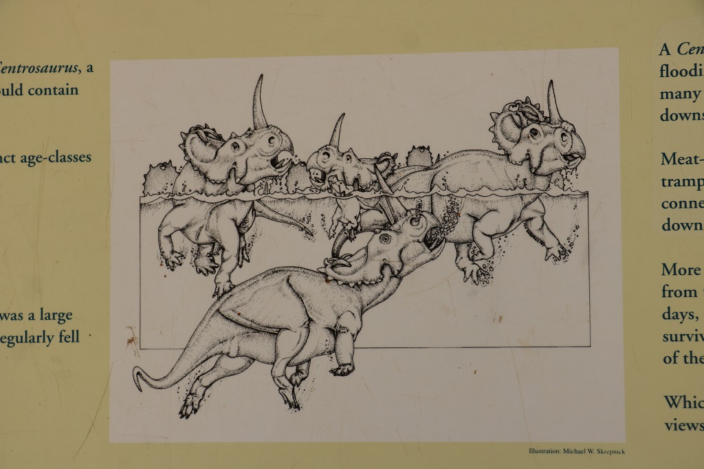 There were two theories about how so many bones ended up in such a muddled pile (the paleantologists think about 300 animals). One was a flash flood and the other was a disaster caused by so many large animals crossing a deep river at once and having many of them jostled off their feet and swept away. The majority of the bones belong to Centrosaurus, but there are also teeth from a flesh-eating dinosaur that broke off when they were feeding on the drowned ones. Many of the bones of the Centrosaurus show tooth marks and breaks.