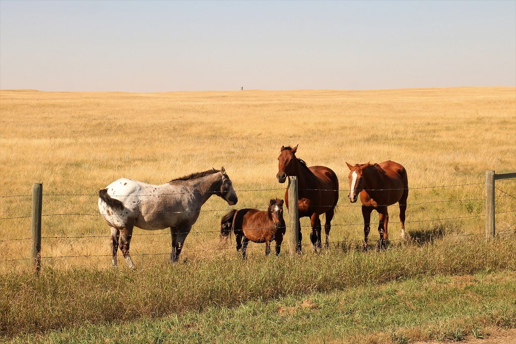 We stopped for a few minutes so I could pick some grass for these horses. The Appaloosa and the foal would not come near me, the bay took one handful, and the sorrel happily ate all the rest.