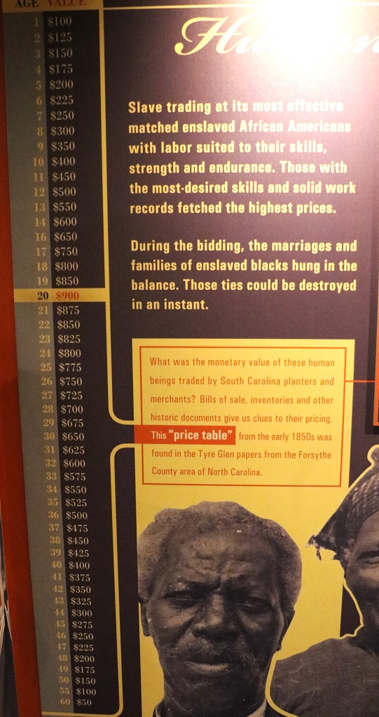 Slaves, especially young strong ones, or women in child-bearing years were expensive. It was not uncommon to pay half the price at the time of purchase and carry a loan for the other half that was payable in a year. The bar along the left side of the image below shows the price per age beginning with a 1-year old for $100 down to 60-years old for $50. Thr most expensive was a 20-year old. The longer your ‘earning’ potential or the better your skill the higher the price. Since many of these slaves came from the north they had training in many things like carpentry or blacksmithing. The African slaves were prized for the plantations because they knew how to cultivate rice that quickly became a lucrative cash crop for plantation owners.