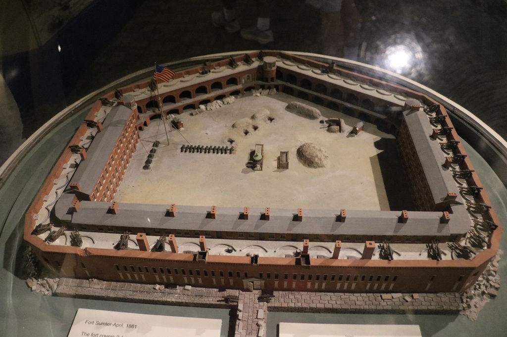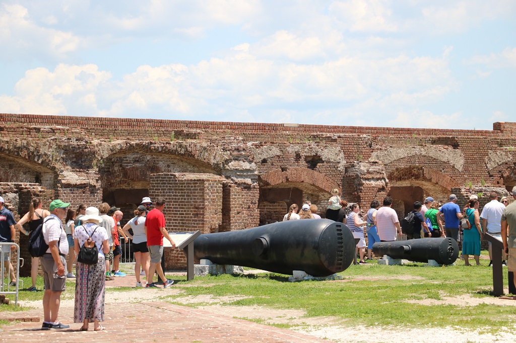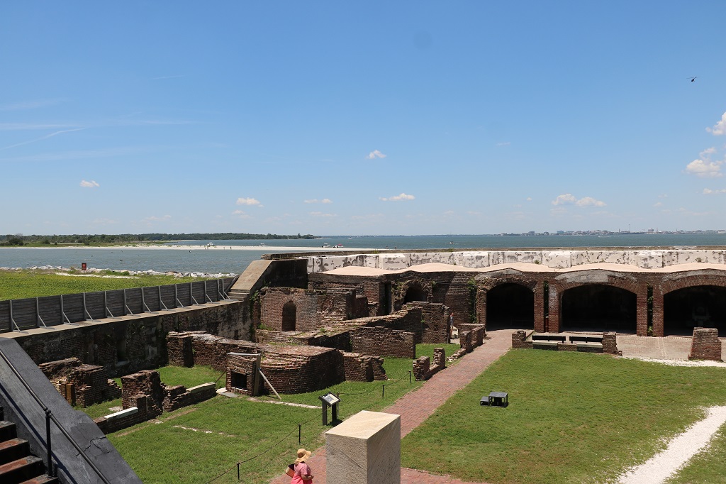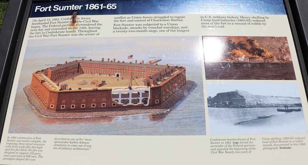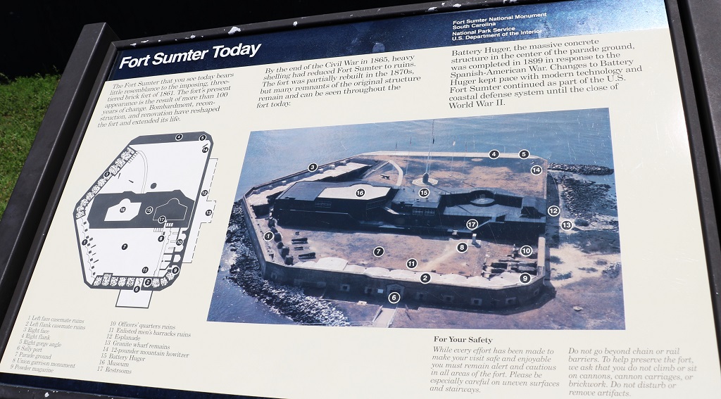 Fort Sumter is a National Park but you can only access it by taking a Fort Sumter Tour that runs the ferry to the island. The fort itself is the island. There is almost no additional land outside the walls. The current walls are about a third of the original height afterthe damage caused by all the shells that were lobbed at it during the Civil War.