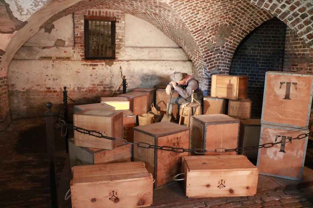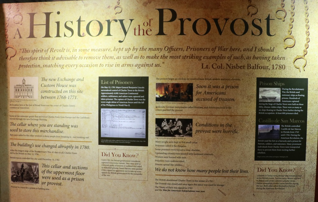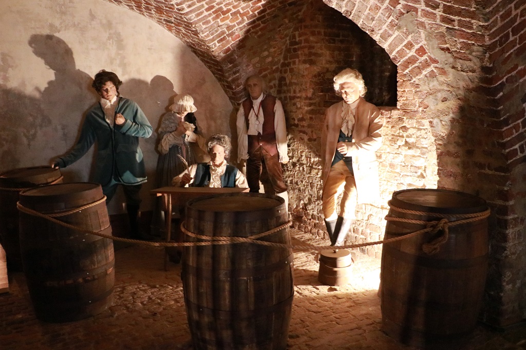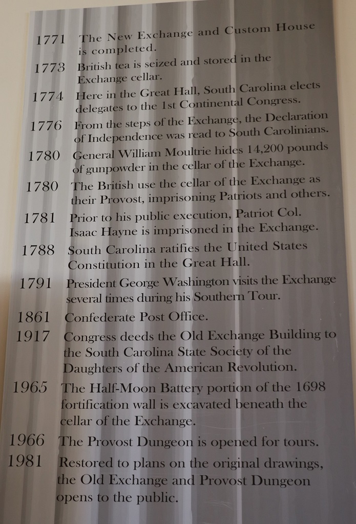 During the siege of Charleston in 1780, General William Moultrie moved 14,200 pounds of gunpowder that had been stored in the Powder Magazine to the basement of the Old Exchange and bricked it up to keep it safe. It was hidden in a room behind the grated window. They built a false wall in front of it and stacked crates in front of the wall. When the British commandeered the building for their headquarters and made the cellar into a prison they never discovered the false wall and hidden gunpowder. After the Americans liberated the Exchange in 1782 the gunpowder was discovered. Two-thirds of it was dry and still good!