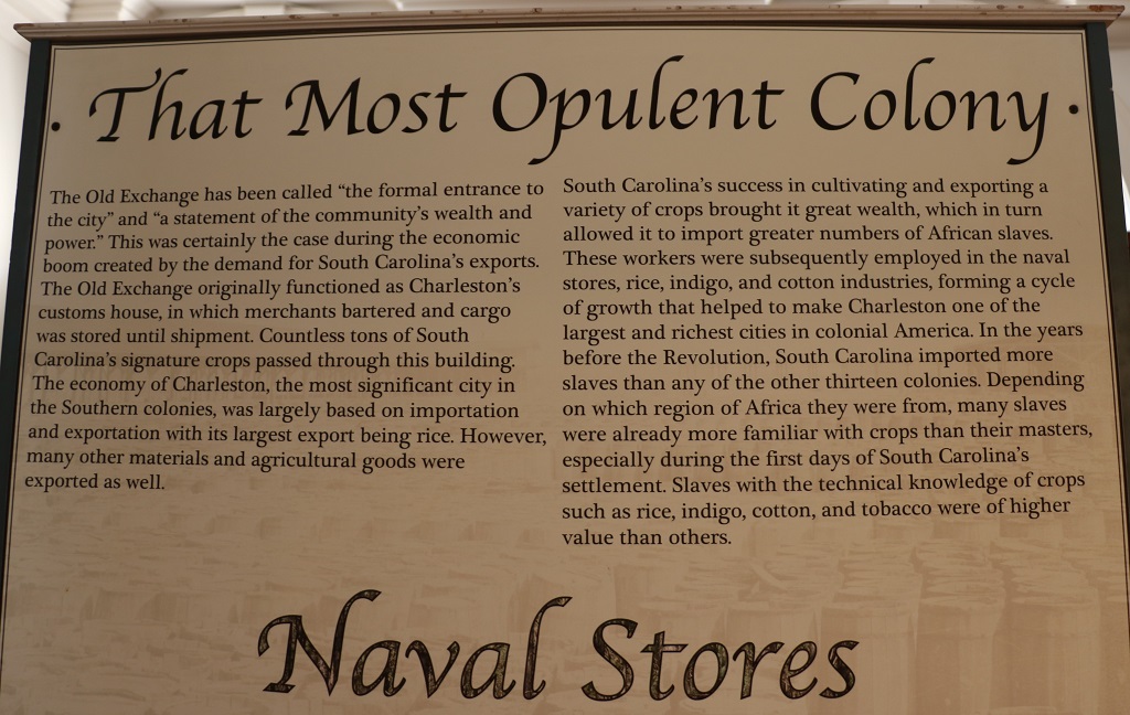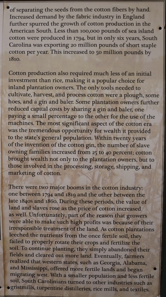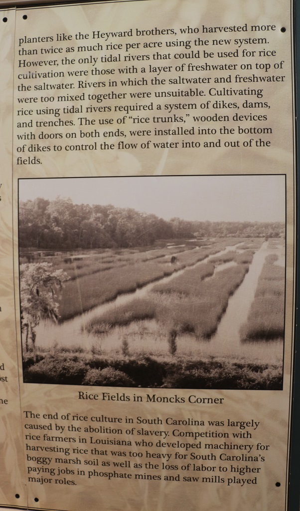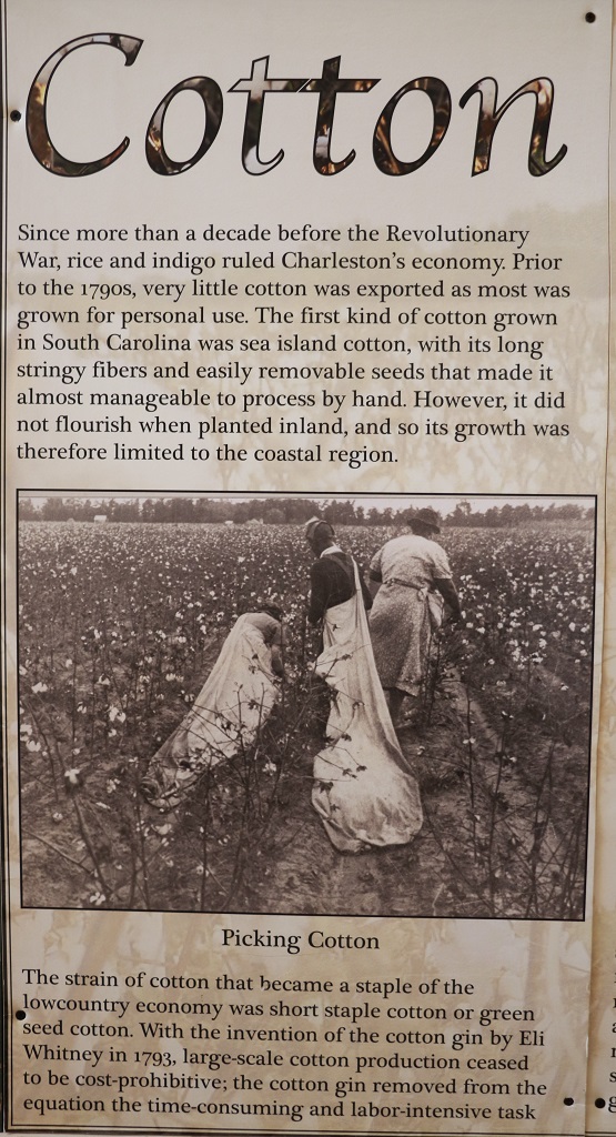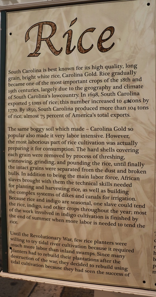 I have included the next several information boards because they tell a lot about the three crops that made Charleston the wealthiest city in the country. All of them were produced on the backs and using the knowledge of the slaves.