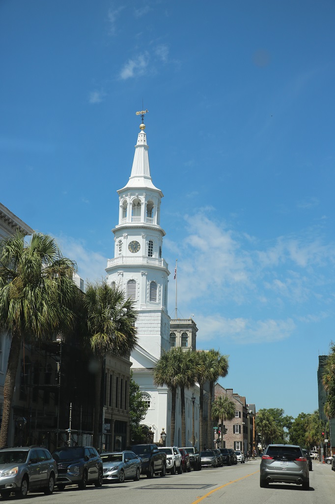 This is the view as we drive from our hotel in Mt. Pleasant and cross the bridge to Charleston. The area is very flat. This whole coastline is called the Low Country and the water table is very high. Water and marshland are everywhere. The city skyline is not high either. There are no skyscrapers in Charleston. There is a law that no building can be higher than the highest church steeple. And there are lots of steeples to choose from. Historic Charleston had 182 churches.