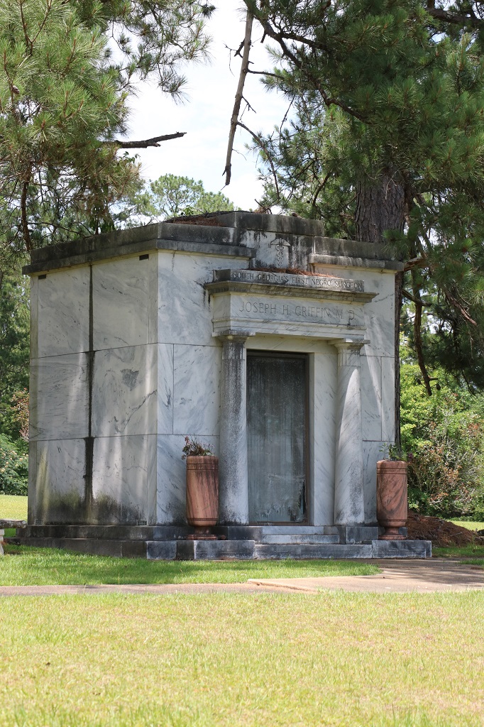 There was a geocache hidden at a small cemetery just west of Cairo, Georgia. The crypt is for Dr. Joseph H. Griffith who was born in 1888 and was a black surgeon in Decatur County, GA during the 1920s to 1960s. He established a hospital for black citizens and has had two books written about his interesting life. All of the graves on both sides of the crypt as well as the one in front belong to Griffin descendants.