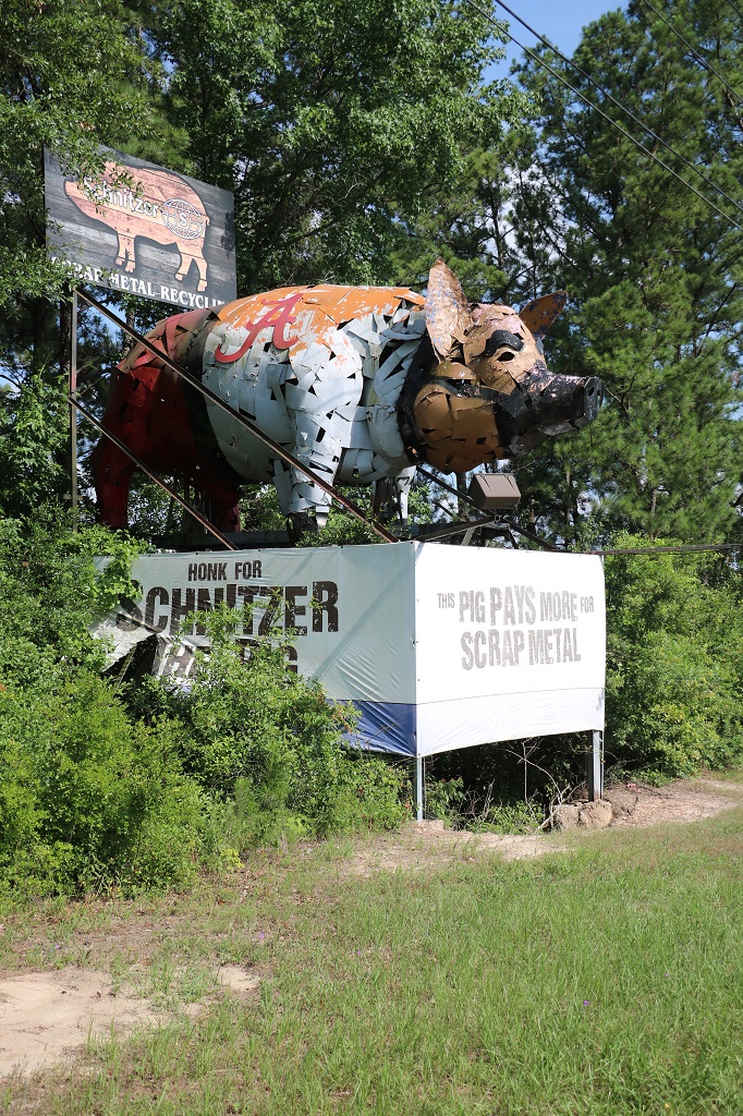 We were able to check into our hotel even though it was only 3 pm in Dothan. We took in the bags and then went to find a few geocaches. This one was not far up the road and had been made by the people in the big scrap metal yard beyond the trees as a monument to a major industry in this area. They wrap the sculpture in lights at Christmas. Dothan also bills itself as the peanut capital of the world.