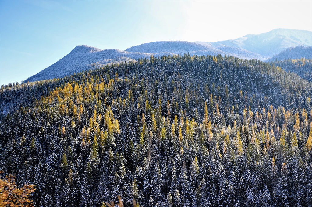 There are lots of larch trees among the conifers on the hillsides around Panorama and when the sunlight hit just right the contrast in the deep green and bright yellow as stunning.