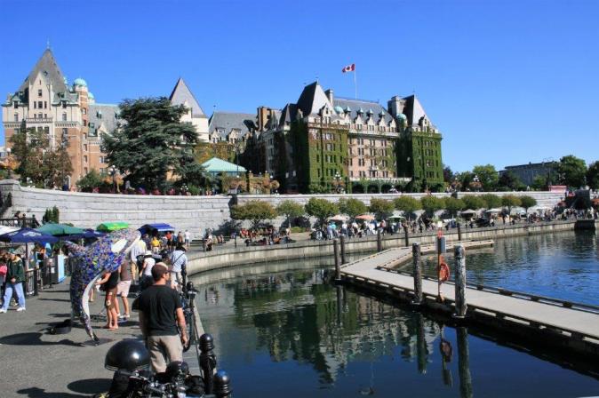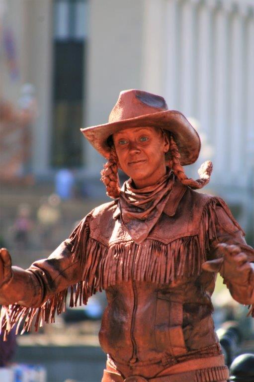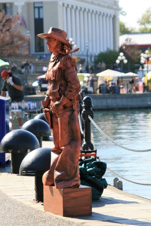 During the ferry crossing we saw a couple of Killer Whales in one of the coastal inlets.  They didn’t seem bothered by the other ferry. Most of our days in Victoria were leisurely and we took quite a few walks along the beautiful Inner Harbour with the Empress Hotel. This “Copper Cowgirl” live statue was excellent.  She held each of her poses for many minutes and was very engaging to watch.