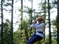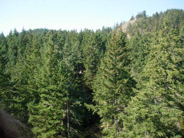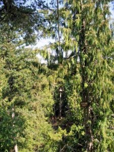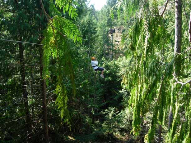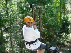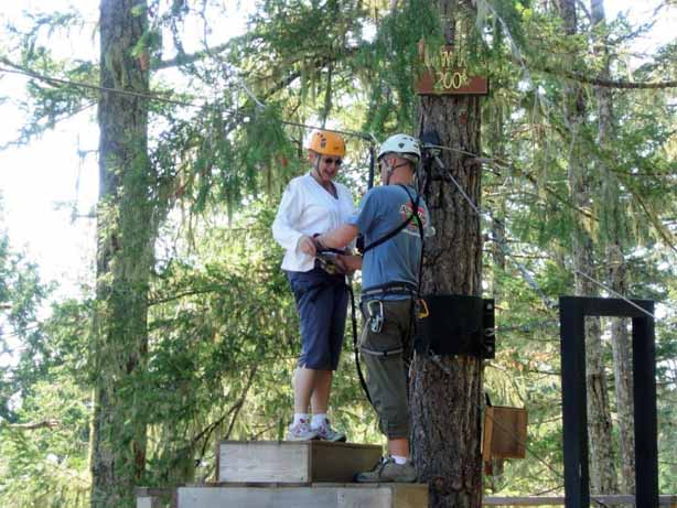 We went to Sooke to go ziplining at AdrenaLINE Zip Lines, which takes you from treetop to treetop.  We had gone ziplining when we were in Princeville on the northern tip of Kua’i a couple of years before and it was a blast so we thought we would do it again.  I video taped John coming in on one of the lines and all you see is a forest of trees and hear a fast whirring sound.  Then suddenly John bursts out of the trees and speeds past me.  Unfortunately the blog site is not set up for video. You will have to settled for these photos that John took of me. As you can tell by my happy expression we had a great day!