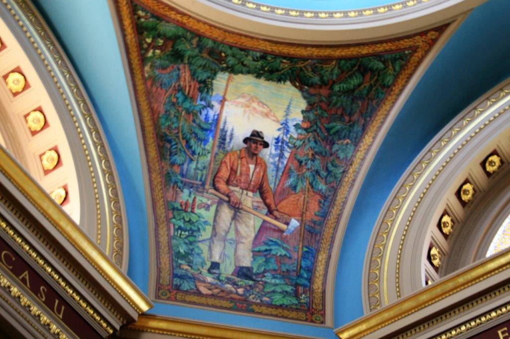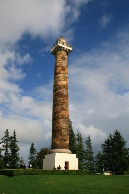 The Queen Anne style house was built in 1883 and covers an entire city block.  It is 11,600 sq. ft and cost a reputed $36,000 to build.  The wood work in the place was absolutely beautiful.  It was gifted to Clatsop County by Flavel’s  great grand-daughter who had inherited it from her Great Aunt Nellie and soon after turned it over to the county for public use and enjoyment. After we left the Flavel house we drove out to the Astoria Column, erected in 1925 as the last of 12 historic markers placed between St. Paul-Minneapolis and Astoria.  The markers were the pet project of Ralph Budd, President of the Great Northern Railroad.