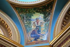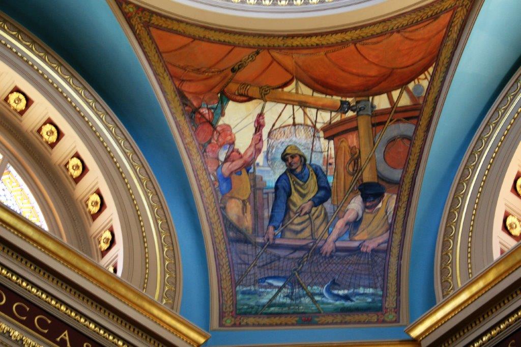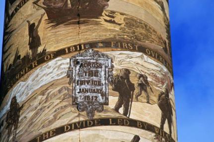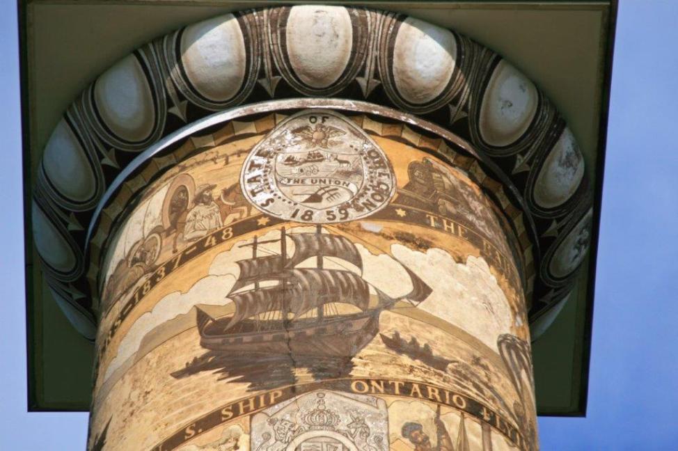 The hand-painted spiral frieze on the Astoria Column would stretch 500′ if unwound.  It is a graffito painting technique by artist Attilio Pusterla and took almost a year to complete.  The paintings commemorate historic events that transpired at the mouth of the Columbia River – beginning with its discovery and ending with the arrival of the railroad.