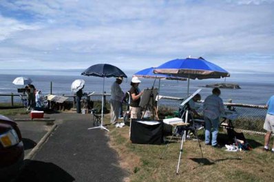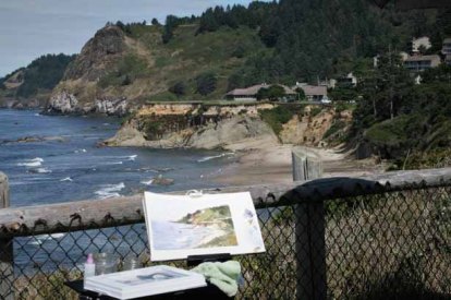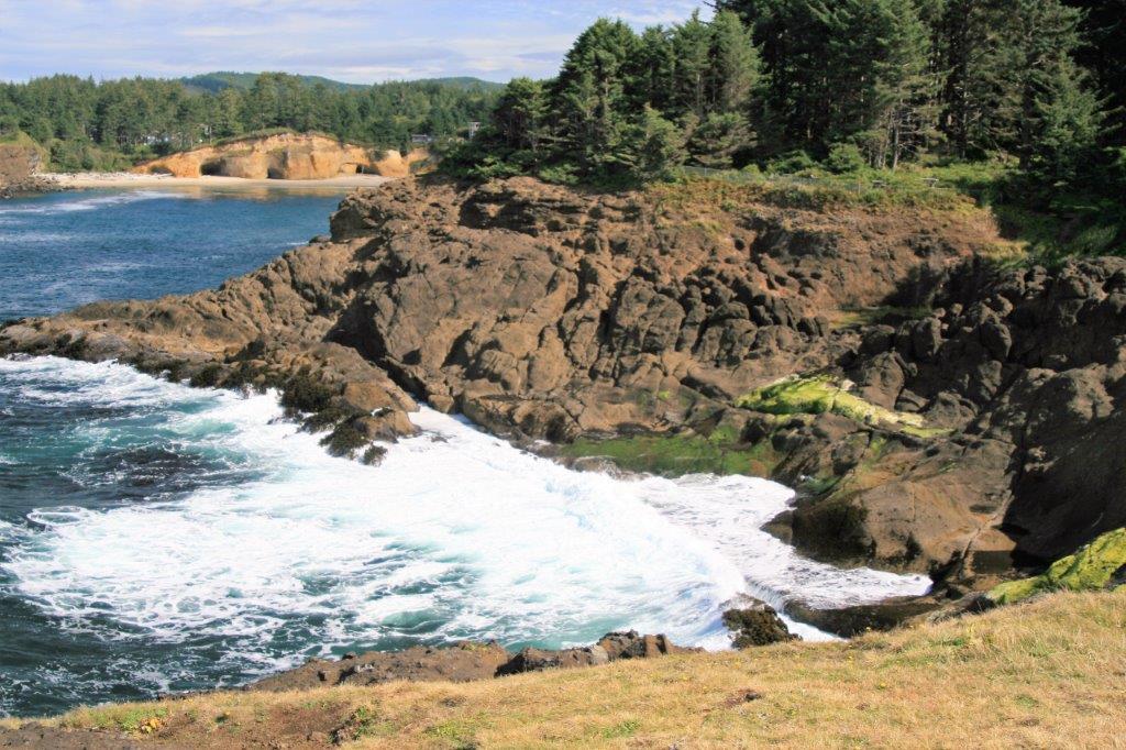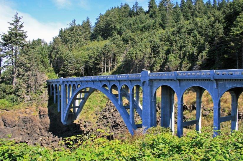 Every time we have driven the Oregon Coast road one of our favourite lookout spots is the Rocky Creek Scenic Viewpoint.  On a nice day, which we had, it is a gorgeous place to get out and stretch your legs.  Beware the wind though, it can knock you over if you are not prepared. This visit we were able to watch a group of local artists do live scene watercolour painting.  You would be hard pressed for a more beautiful and inspiring spot.I like the arches of the Rock Creek Bridge; they remind me of the railway arches in the Harry Potter films – but much shorter and not nearly as high.  We rode over those bridges in 2013 when we toured Scotland and rode the Jacobite Steam Train from Ft. William to Mallaig.