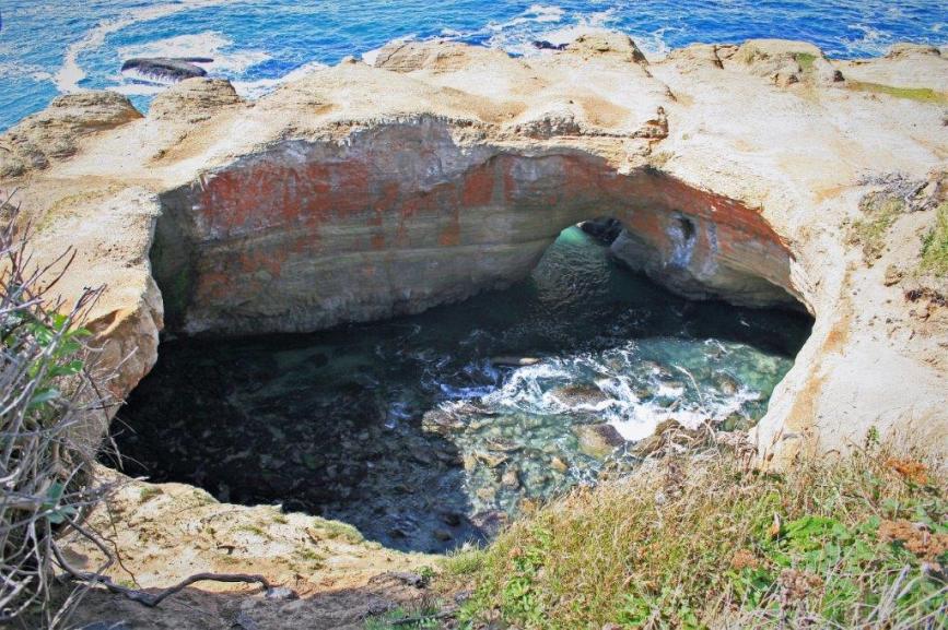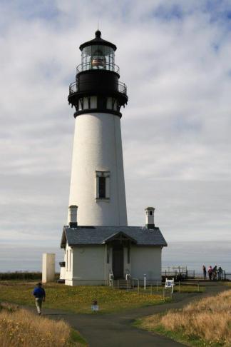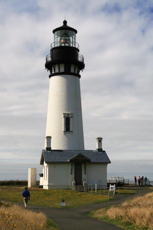 We pulled into Otter Crest Scenic Viewpoint and the Lookout at Cape Foulweather 500′ above the coast.  The view on a clear day, such as were were blessed with, was spectular. A few miles south of Cape Foulweather is the Devil’s Punchbowl.  The tide wasn’t coming in so there was no wave action going on. On this trip we climbed hundreds of winding steps to the top of lighthouses.  If it was open to climb, we climbed.  Below is Yaquina Head lighthouse.