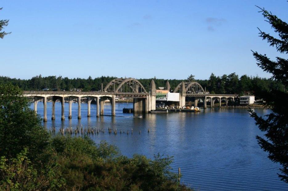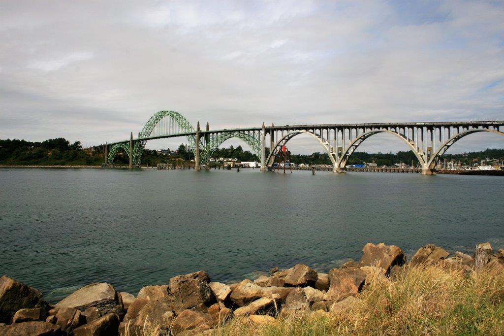 The Yaquina Bridge spans an inlet just north of Newport, Oregon.