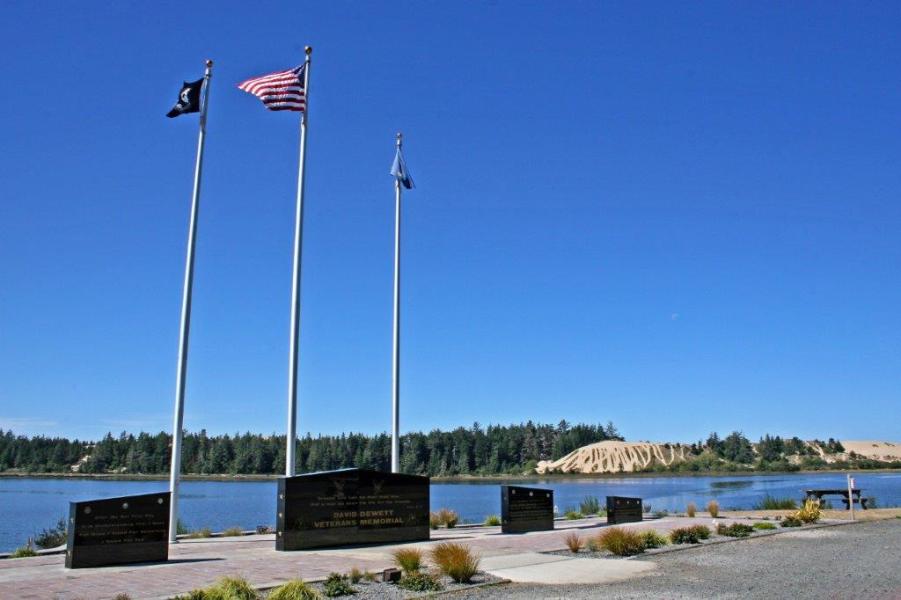 Florence is about mid-way along the Oregon Sand dunes and is in the heart of Oregon Dunes National Recreation Area.  We took quite a few photos of the hardy bunch grass growing in the sand. One of my favourite lighthouse is Umpqua Light.  It was built in 1855 and lit in 1857.  The original lighthouse was located on the sandy shore on the north side of the Umpqua River mouth.  Two violent storms in 1861 and 1863 severely undermined the foundation and the lighthouse began to tilt.  Plans were put in motion to build a new lighthouse, this time 100′ atop the cliff so the light would be easily seen by passing ships who would be able to use it for navigation rather than just an aid to approaching the river mouth as was function of the first lighthouse.  The new light became operational Dec. 31, 1894 and has a Fresnel lens, originally powered by mineral oil.  The light makes a complete revolution every two minutes and in that time produces a signature of two white flashes followed by one red flash.At Coos Bay there is a beautiful Veteran’s Memorial.   We did the Cape Aragos Loop and spent some time at Shore Acres.  You could see the Cape Aragos Light from the beach. At Bandon we headed inland, stopping at Sandy Creek Covered Bridge near Remote, Oregon.