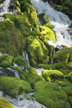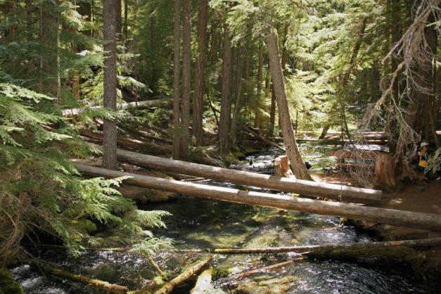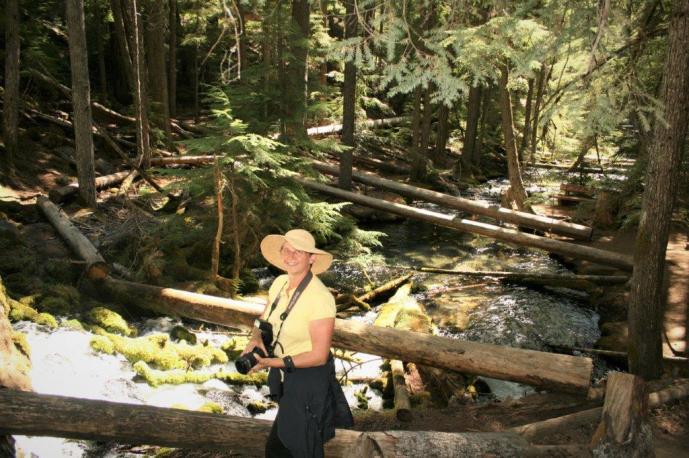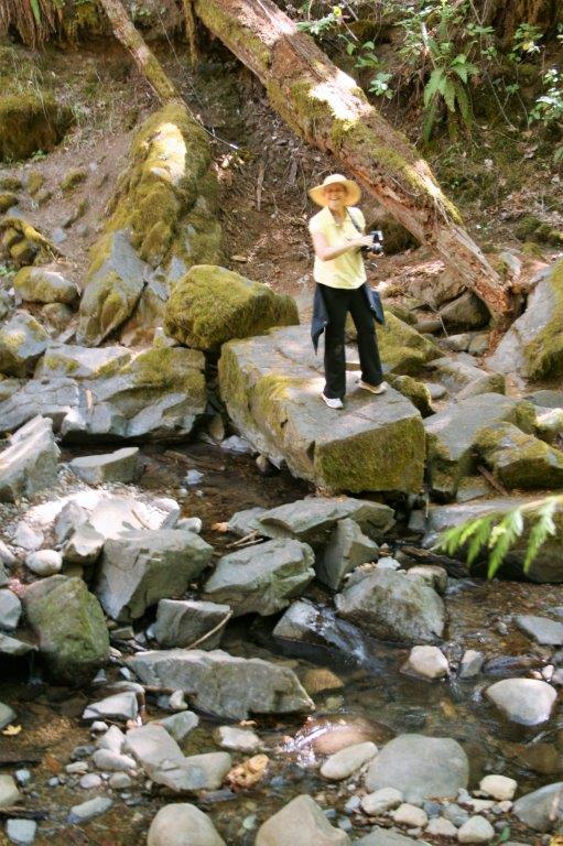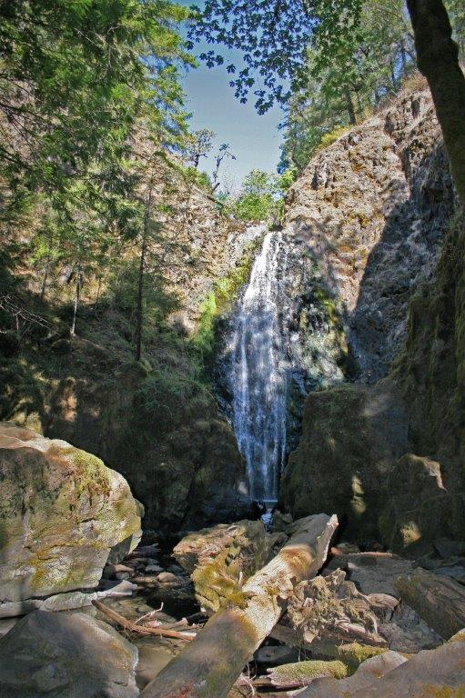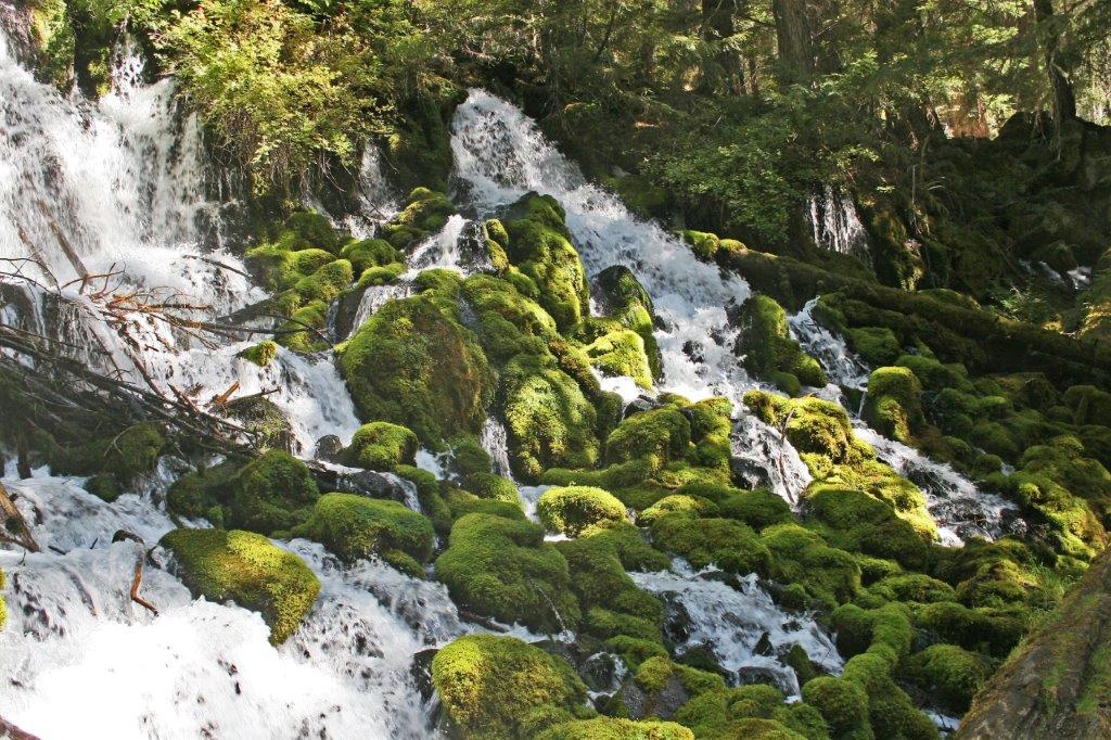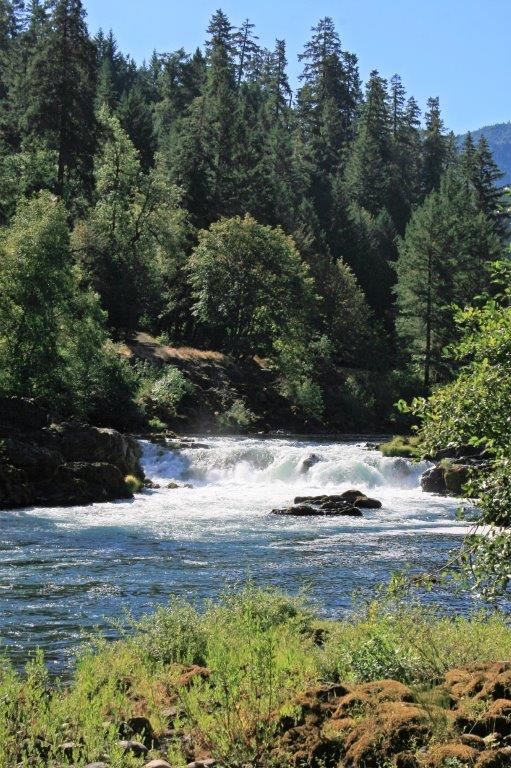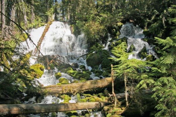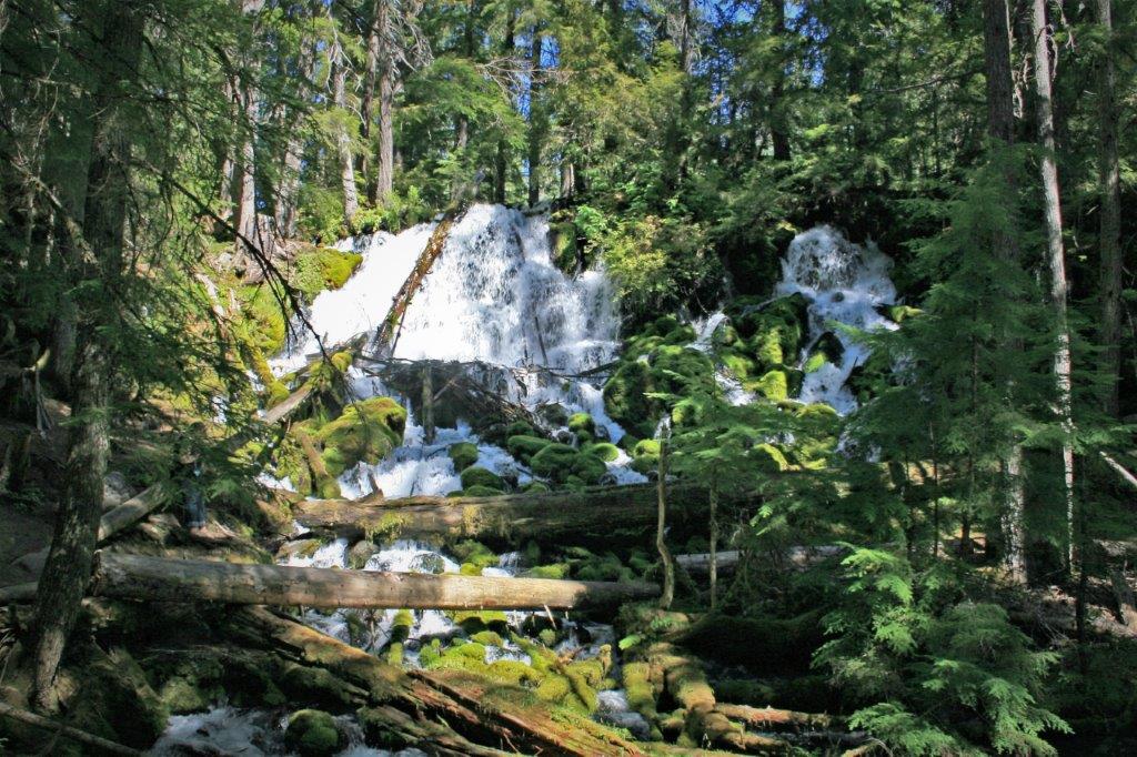 We left Roseburg and headed east.  About an hour later we pulled into the parking lot by the trailhead to Susan Creek Falls.  It is only a 3/4 mile easy hike and the falls are not spectacular – they  only drop 35′.  Still, it was a lovely area with all the wet moss on the criss-crossed logs.