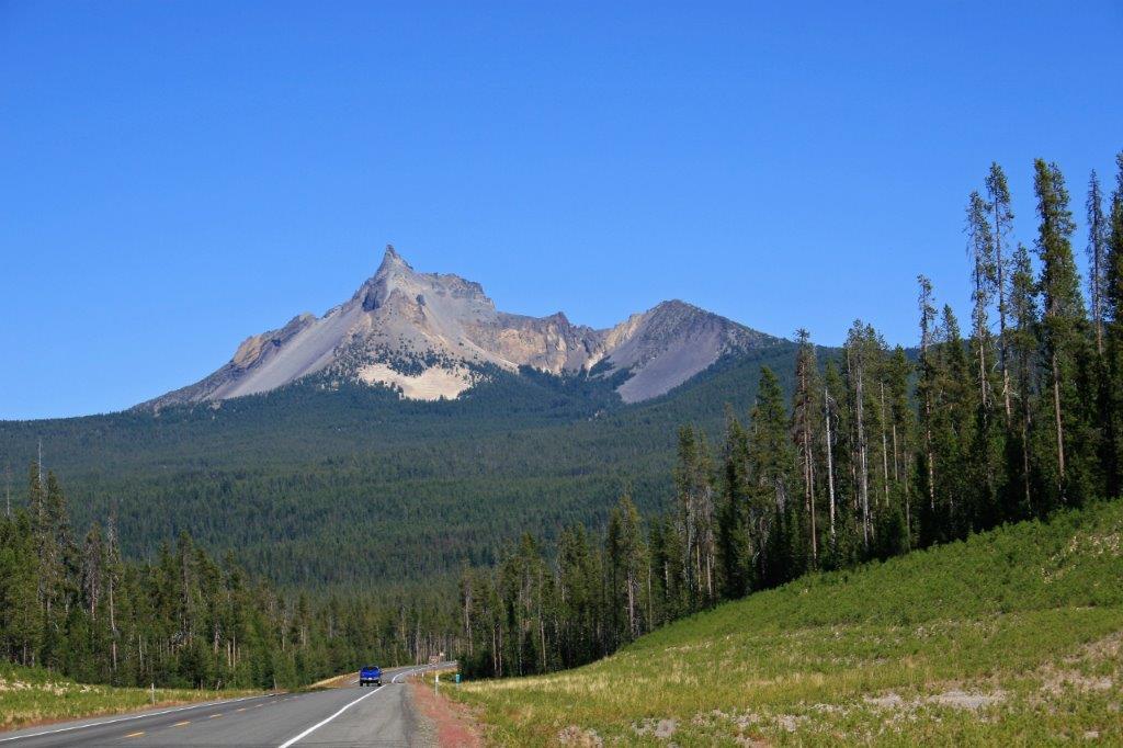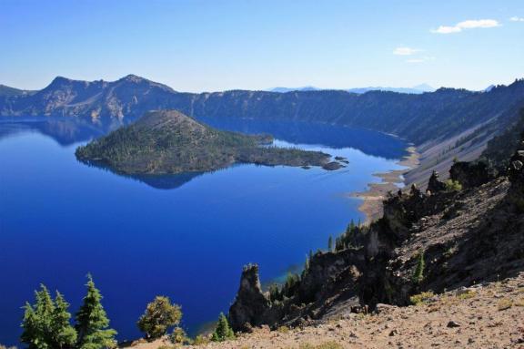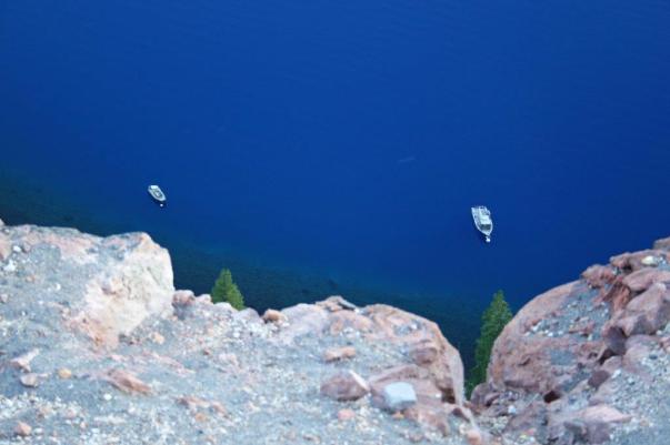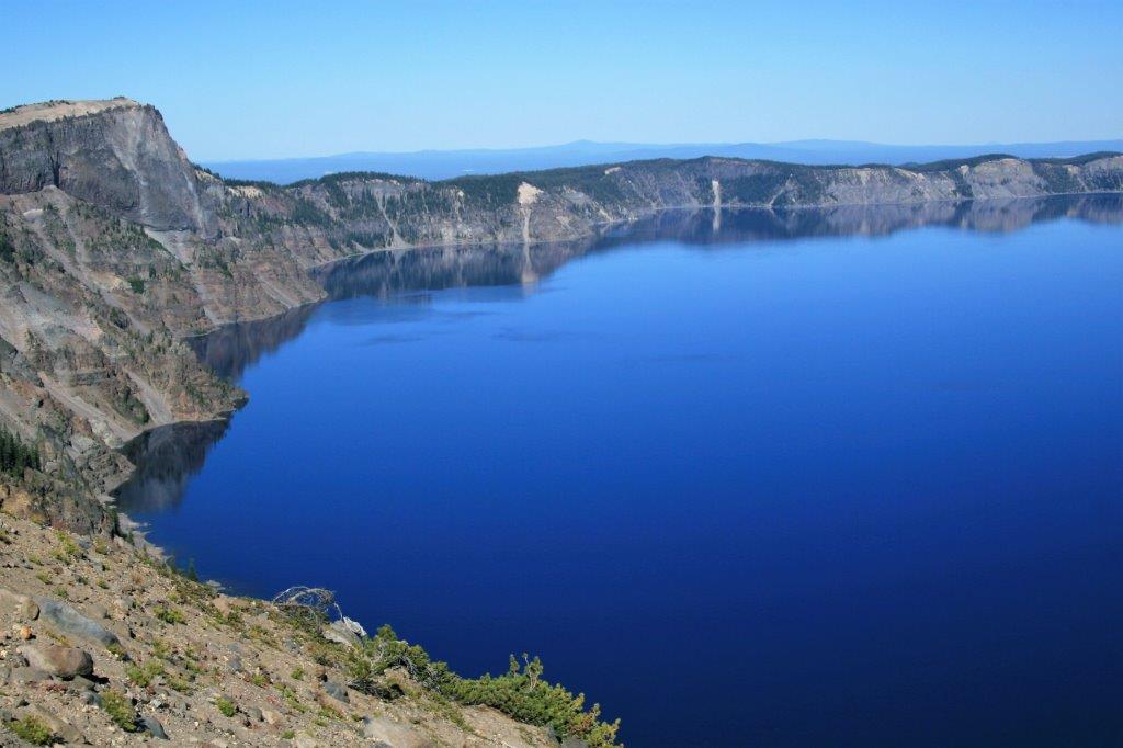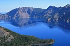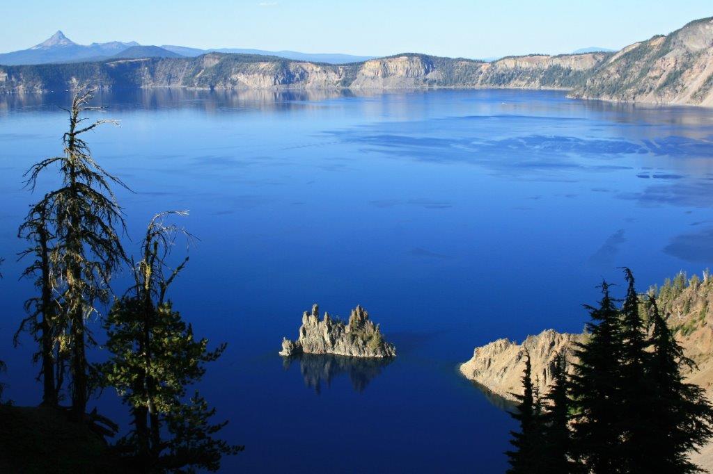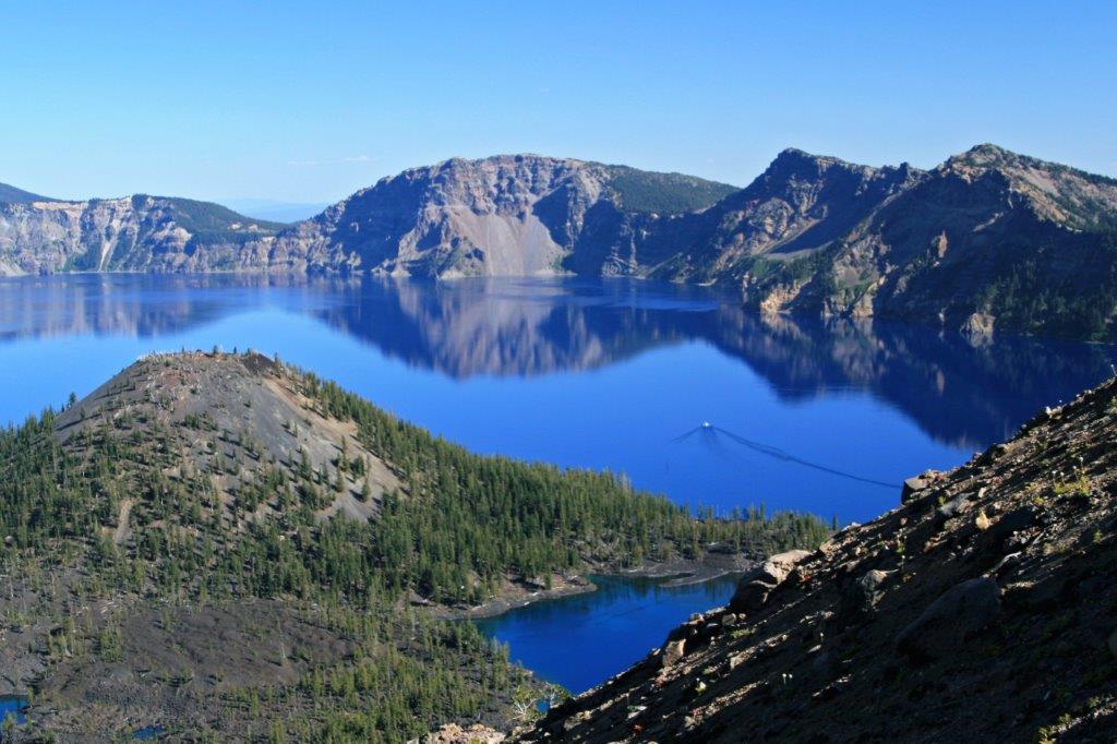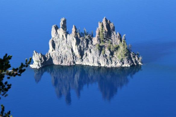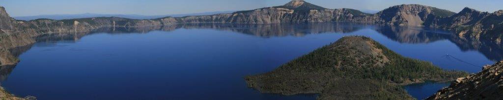 Later lava eruptions created Wizard Island.The view outward from the rim road was pretty nice as well.The sides of the crater down to the lake are almost vertical and drop hundreds of feet before reaching the water.There is a access to the lake via a steep, narrow road on the far side.  The lake is also stocked with fish for the enjoyment of anglers. On the far side you can see the smaller island called Phantom Ship. This shot was taken holding my camera out over the rim edge, pointed straight down.  Those boats are a long distance away. I made a stitched photo of Crater Lake.  It is pretty narrow, but you get the idea about its incredible beauty.We descended down the back side of Crater Lake National Park, turned north when we reached Highway 197 and drove up to Bend where we spent the night.