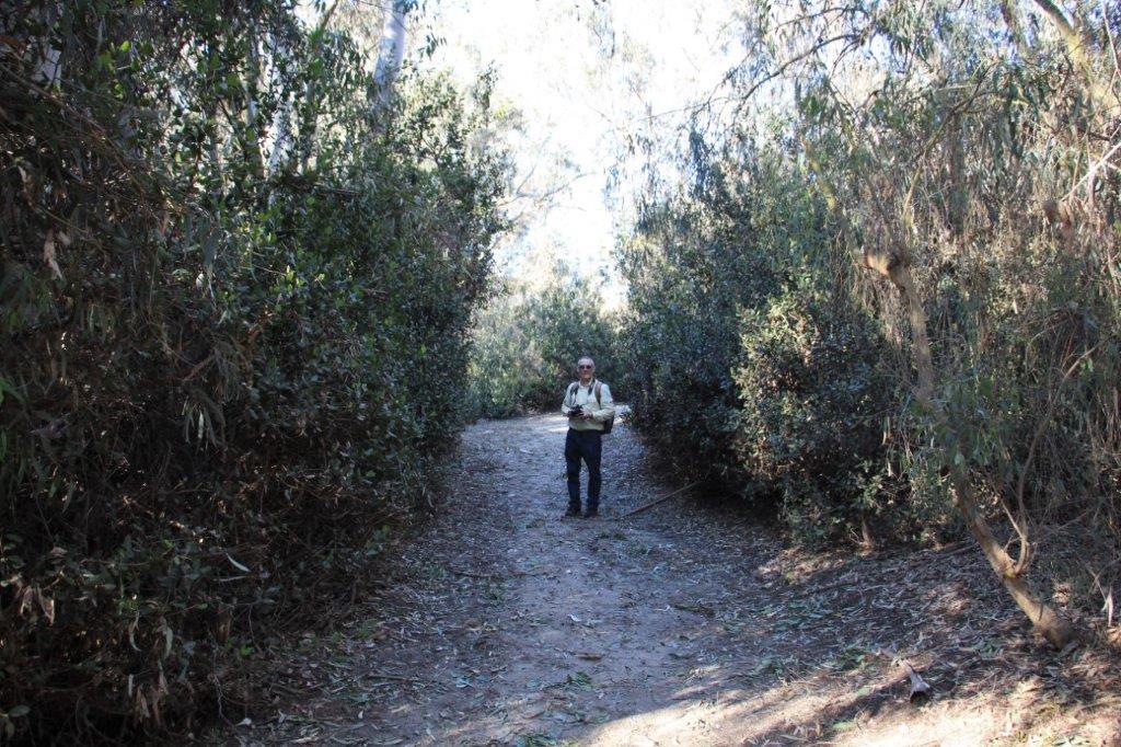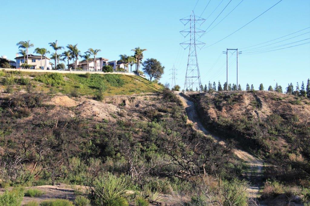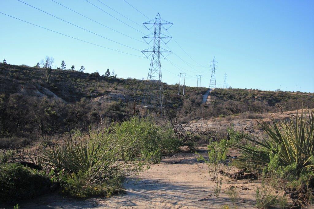 When we got to the end of the power line we found the area fenced and gated. John noticed that a section of fencing had been torn down so we climbed over and walked down the drive to Aviara Parkway and two miles back to the condo.