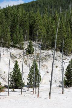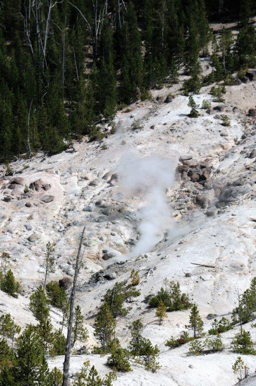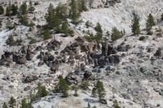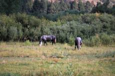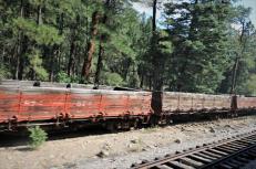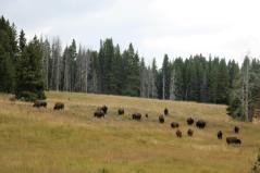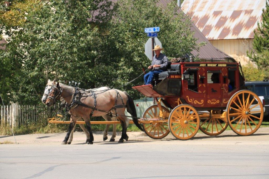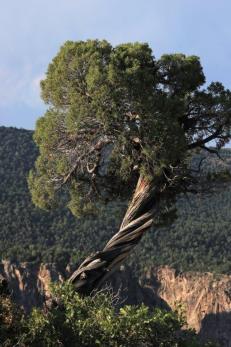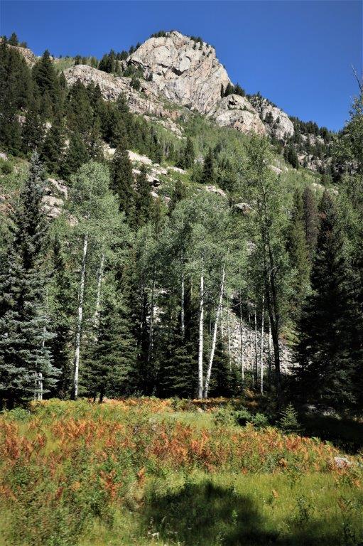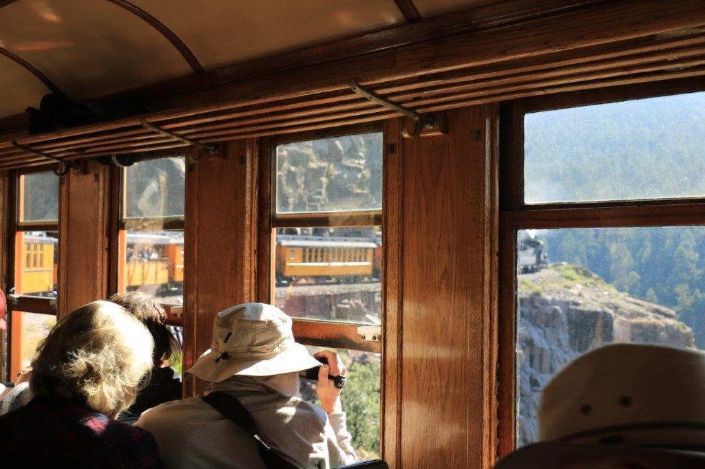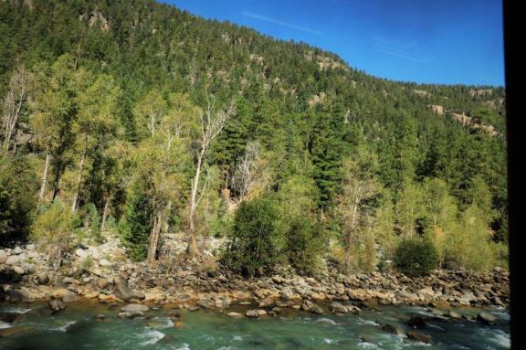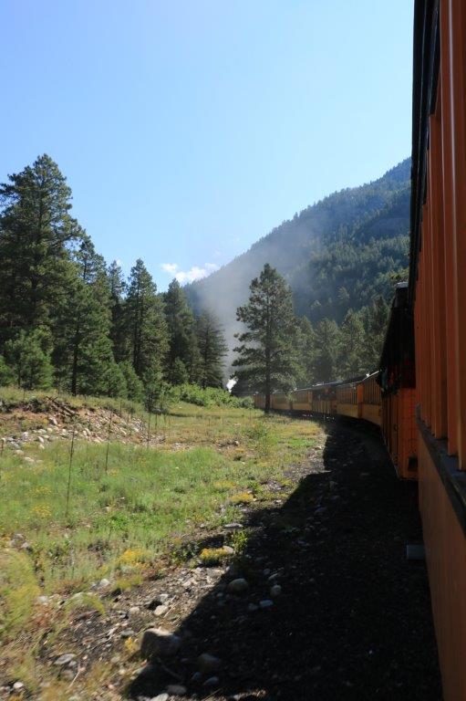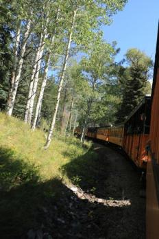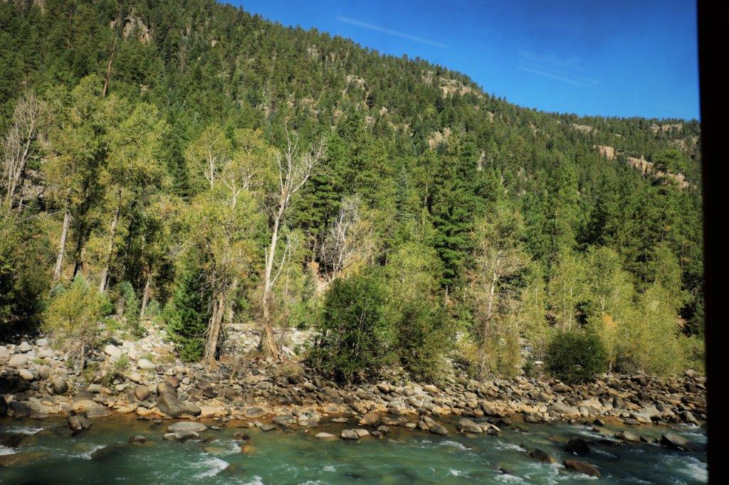 The Aspen trees are beginning to change colour and every once in awhile there would be some lovely pockets of bright yellow. Something we learned on our train ride yesterday was that, until recently, Aspen groves were considered the largest living organisim on earth. There is one grove that covers 1 1/2 acres (recently a type of fungus that grows from a single ‘root’ was discovered in Oregon and it covers over 4 acres). An Aspen grove is not comprised of individual trees, rather it is one tree that sends out many underground shoots to create new trees. This is why Apsens are one of the first trees to re-grow after a forest fire. They have so many underground root shoots that even if the large center trees are destroyed new ones will soon start to grow. Our narrator on the train called them Family Trees with the Grandparents in the center, parents a bit further out and the children, the youngest, smallest trees at the outer edge.