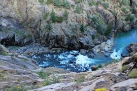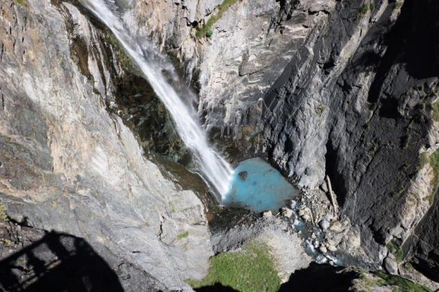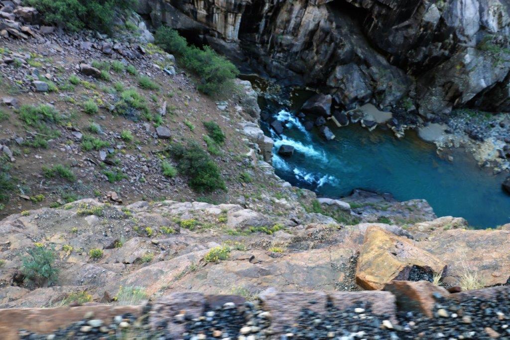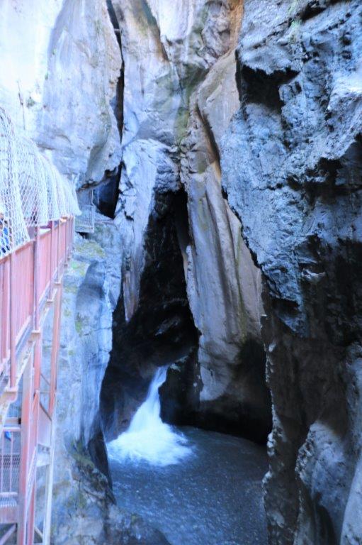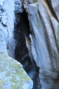 You cannot see the waterfall. You can certainly hear it crashing into the bottom of the canyon but the water flows down through a hole in the rock. I tried to make a vertical stitch image that would give you an idea but the rocks are so dark and the space is so tight you can’t really understand what the photo is all about. The other one is a close-up of the only bit of water you can see where it comes out the bottom. Really an amazing place.
