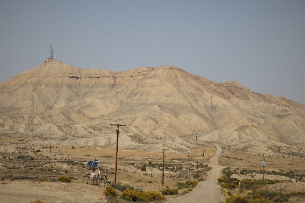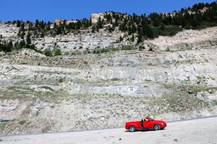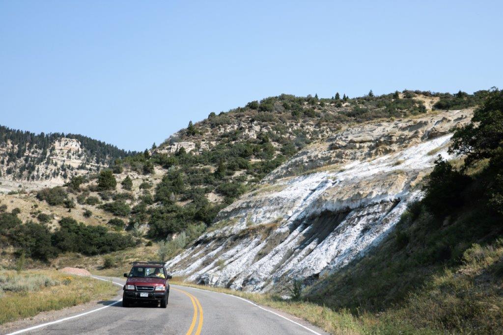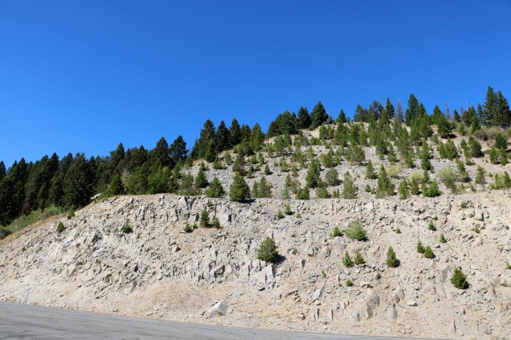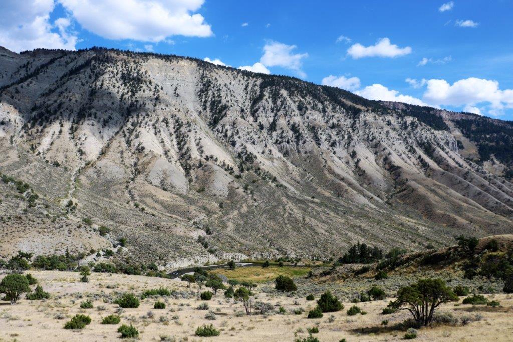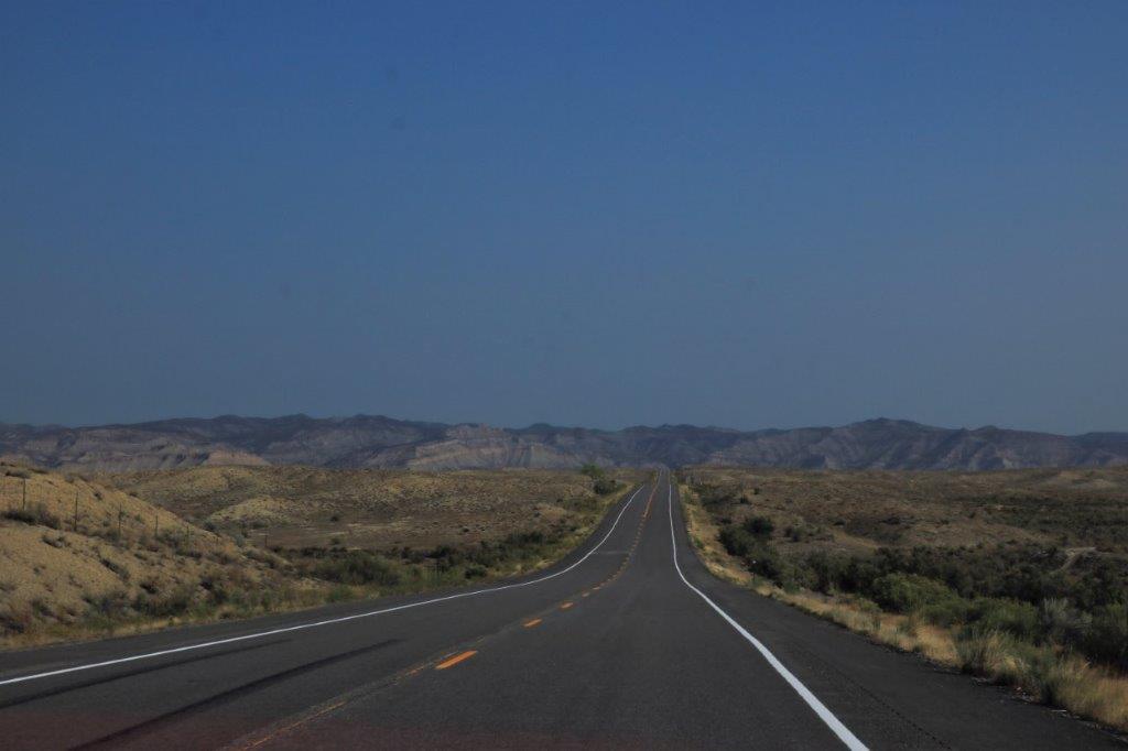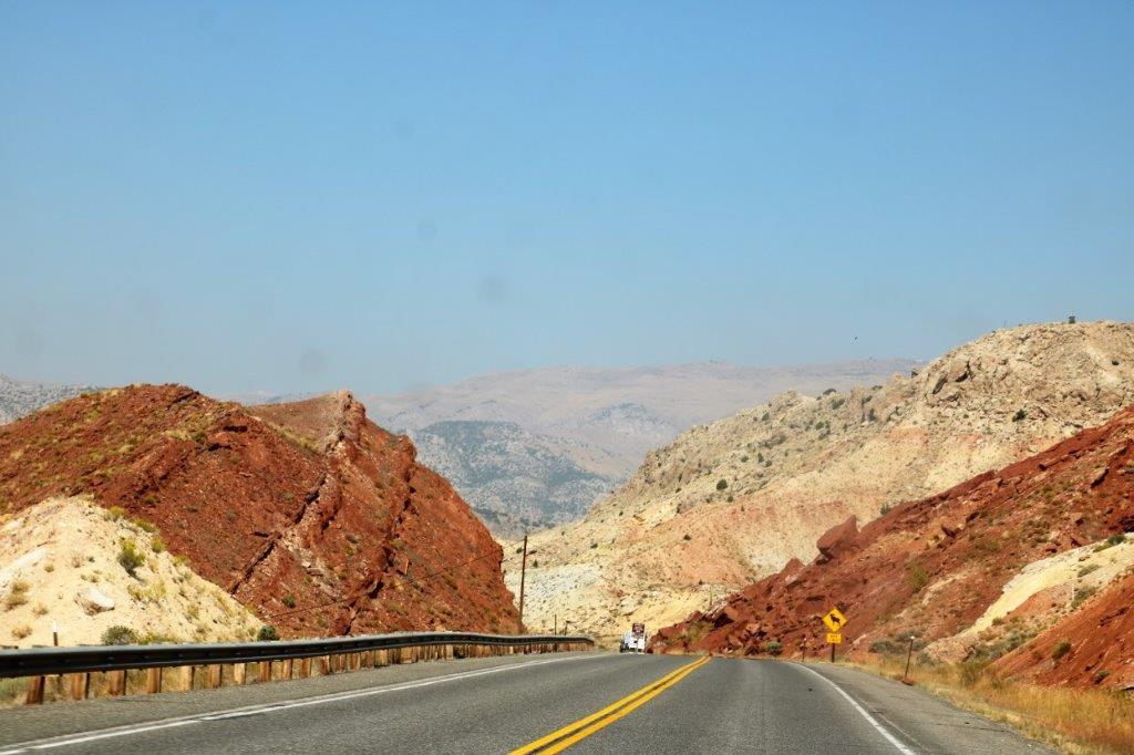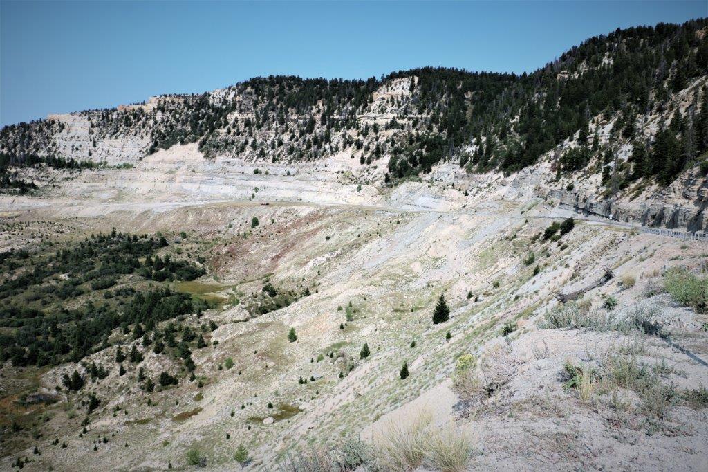If you look closely you can see the cut of the road across the middle of the mountain in the background and on the left side about middle distance.