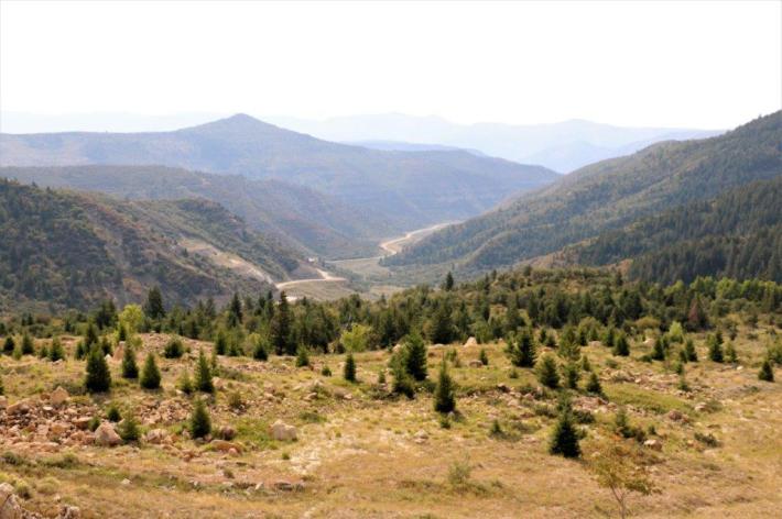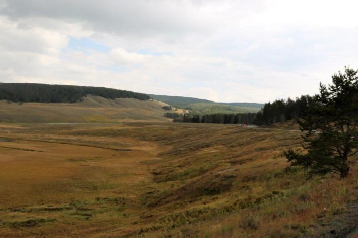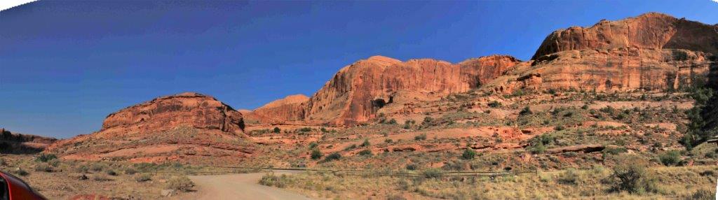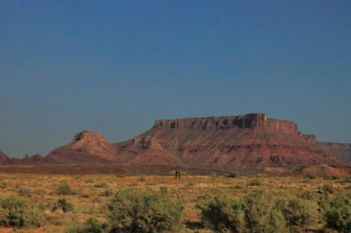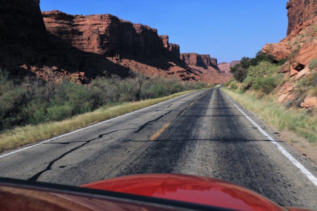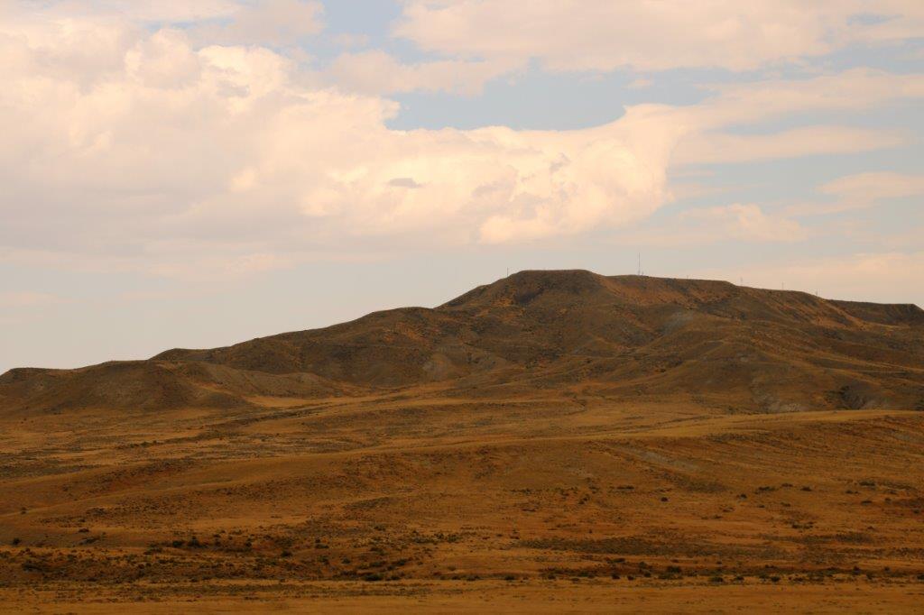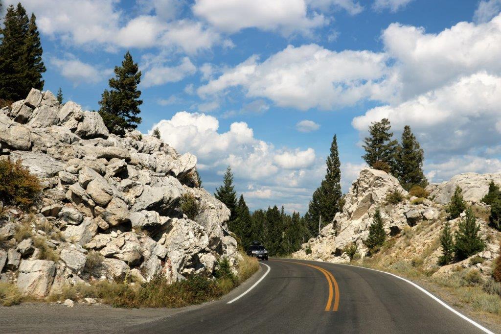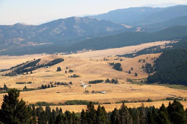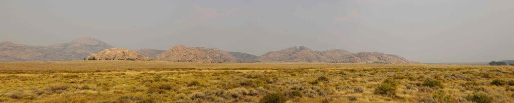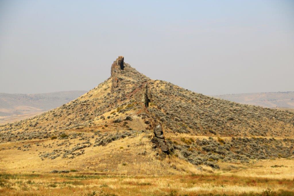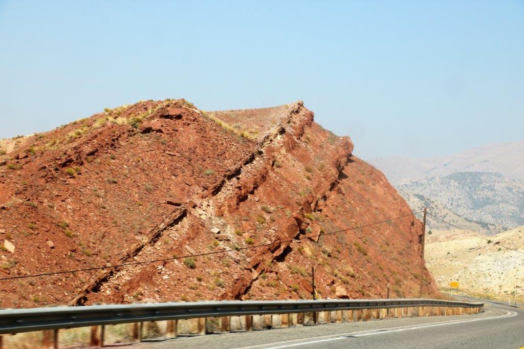 If you look closely you can see the cut of the road across the middle of the mountain in the background and on the left side about middle distance.