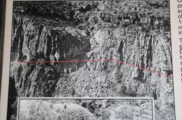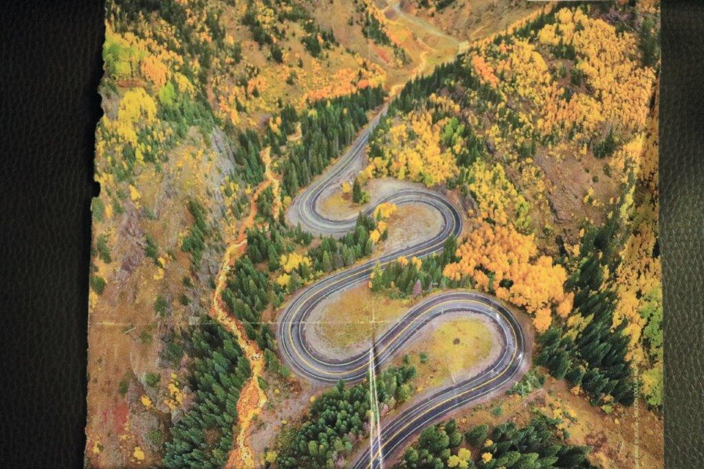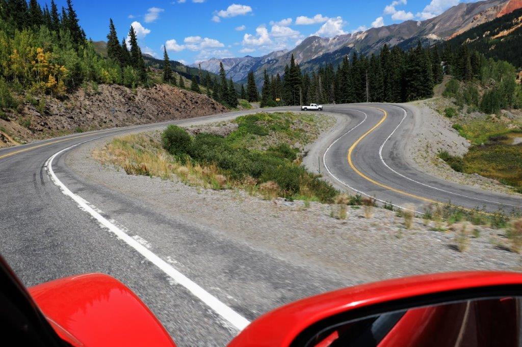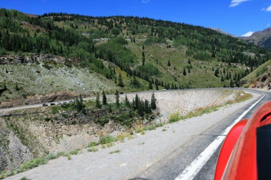 The road between Silverton and Ouray is called the Million Dollar Highway due to the high mineral content of the gravel used in grading the road (and also the high cost of its construction). This passage of road is a series of S-curves. John, of course, had fun. There was a photo of this stretch of road in one of the tourist booklets. It was taken in the fall when all the aspen were in their fall glory but it shows what the road looked like.