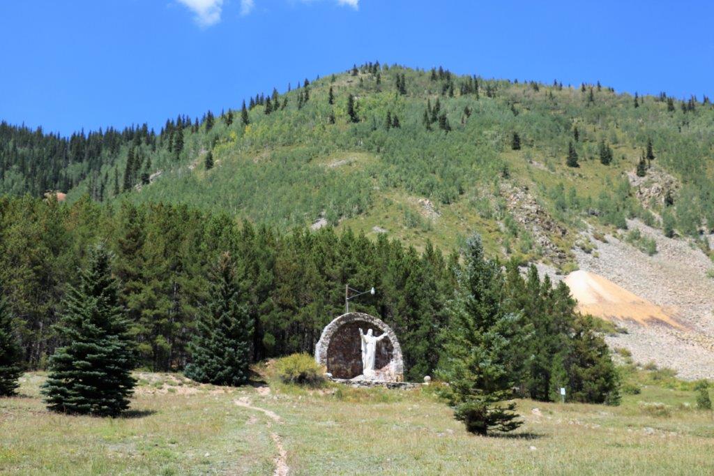 We didn’t take the turn into town since we had been there yesterday but we did take the turn off on the other side of town to go half a mile up a gravel road to see the Miner’s Shrine that had been erected on the hill overlooking Silverton. We had been told that the Italian miners had a piece of Carrera marble sent from Italy to be used for the statue of Christ for safety of the miners.
