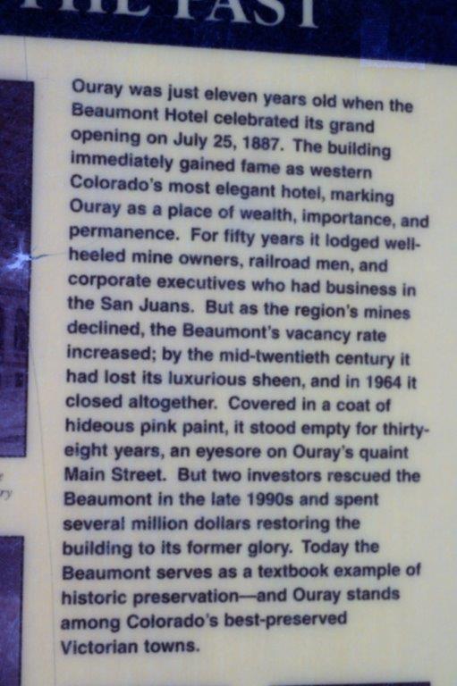 At the overlook just before we dropped down into Ouray we met three local fellows that had just come home from the Four Corners Motorcycle Rally in Durango. They officially greeted us to Ouray. We had a really nice chat with them. I asked if they had a welcome goodie bag and they said no, but I could have a beer. I said if I liked beer I would be happy to have one.
