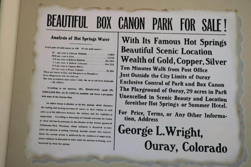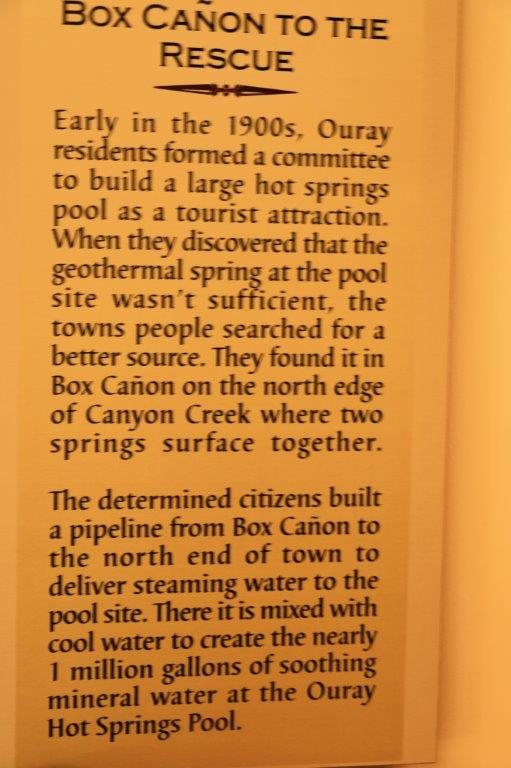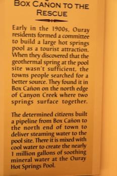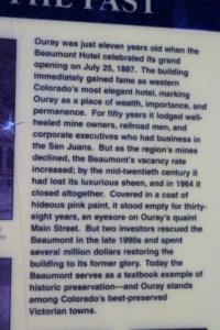 Ouray is noted as a Victorian town. Many of the buildings of that era are still in use and have been beautifully restored. Ouray is also home to a box canyon on one edge of town and a hot spring on the other.