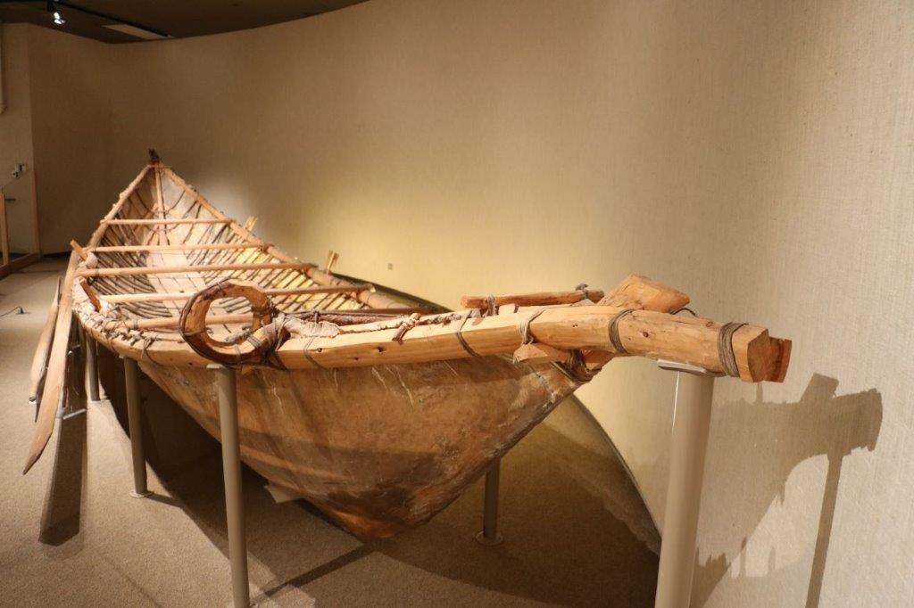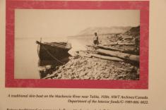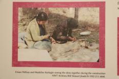The canoe is hanging from the ceiling above John and all the photographs on the wall document it’s construction.