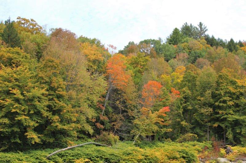 IMG_1135 IMG_1152 In Vermont we turned south since we must get below the slash of  Lake Ontario to go west to Niagara Falls.  It didn’t take long either before we noticed that a lot of the lovely rich reds and oranges of the trees in New Hampshire were disappearing in favor of yellows and golden green.  The leaves are just not as far along in their seasonal change as those just a bit further north.