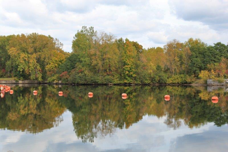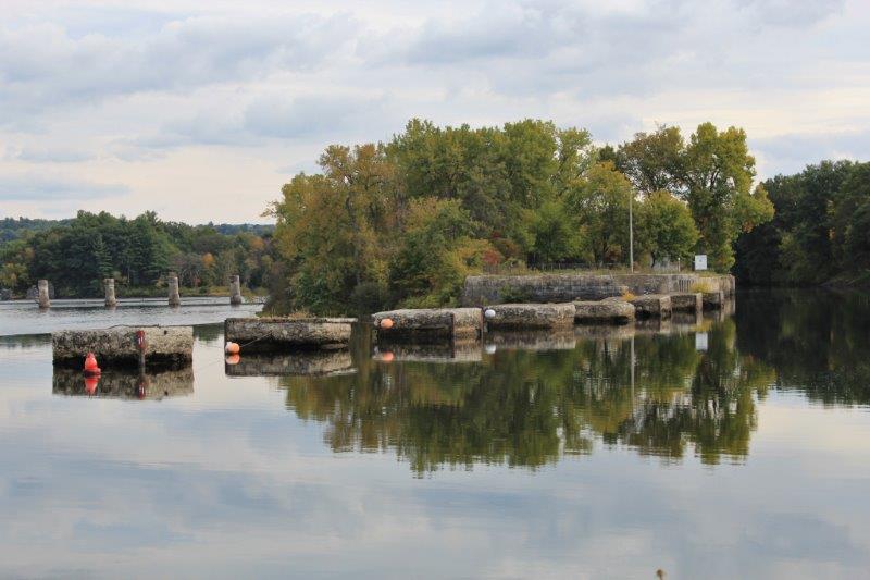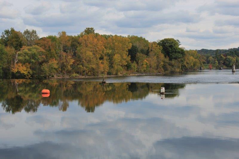 For the majority of our drive south in New York we paralleled the Champlain Canal.  We passed signs for at least 9 locks.  The Champlain Canal extends 60 miles from Lake Champlain near the Quebec border to the Hudson River in New York City.  The canal was constructed simultaneously with the Erie Canal and was used by commercial traffic from 1823 to 1970.  Today it is primarily used by recreational boaters.  Not far past the end of the canal I saw some beautiful reflections in the quiet water before a low waterfall.