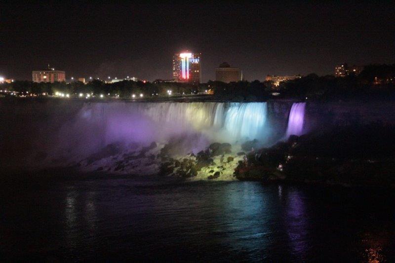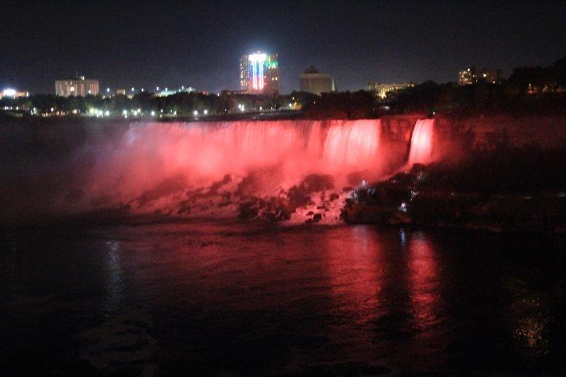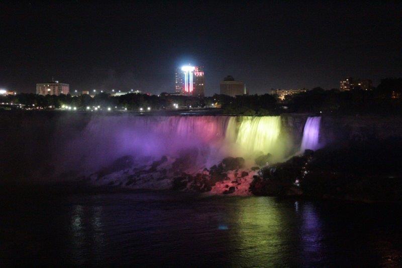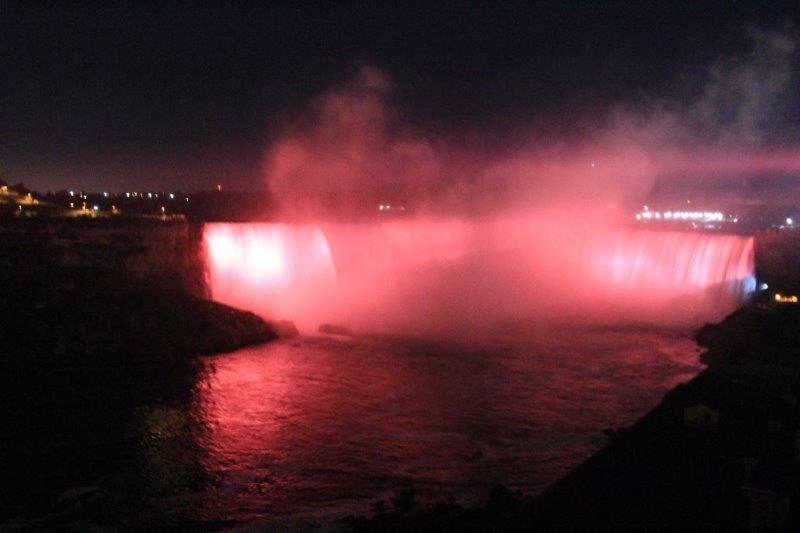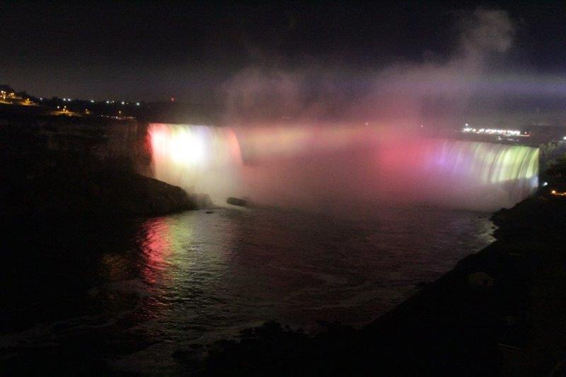 IMG_1366 IMG_1386   IMG_1367 IMG_1387IMG_1395 IMG_1370 IMG_1372 IMG_1371 IMG_1381After we had dinner – great Italian food – we walked down the hill to wait for the lights to come on. We had to wait almost 45 minutes but eventually both the US and the Canadian falls were bathed in light.  The colors would change periodically so we watched for over half an hour before going back to our room for the night.