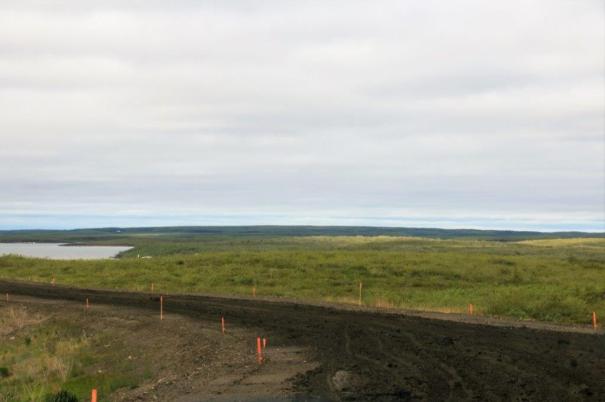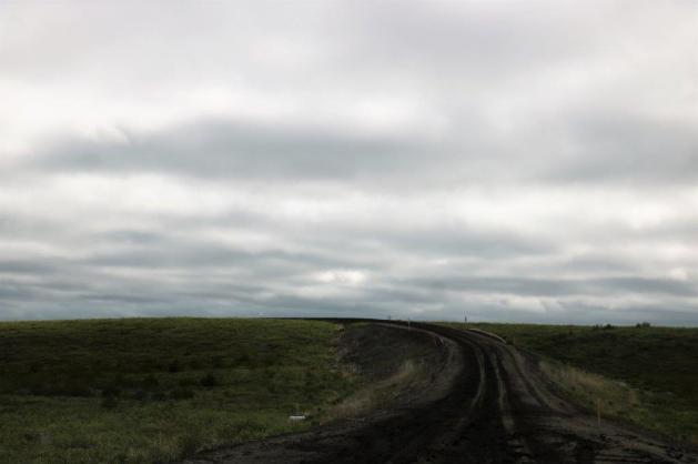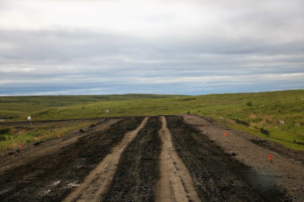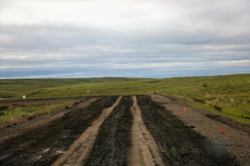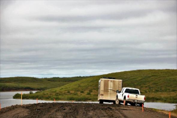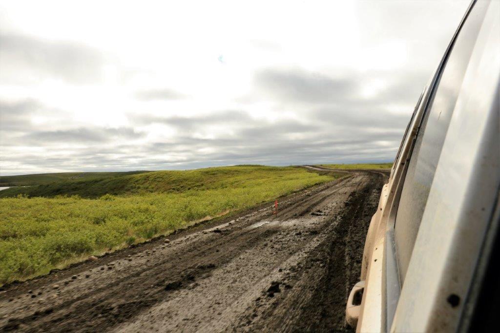 We woke at 6:45 to see that it was raining. Not a good thing on the Dempster Highway. The road is built on a gravel bed above the permafrost and when it gets wet, the calcium and other minerals in the soil leach to the surface and create a slippery mess that tires cannot get a grip on. All the space in the treads just fills up with the muck and you have no control of your vehicle.